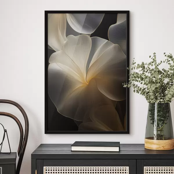 Poster Abstracte, vloeiende, doorschijnende bloemblaadjes met delicate lijnen, tegen een donkere achtergrond N° f47860