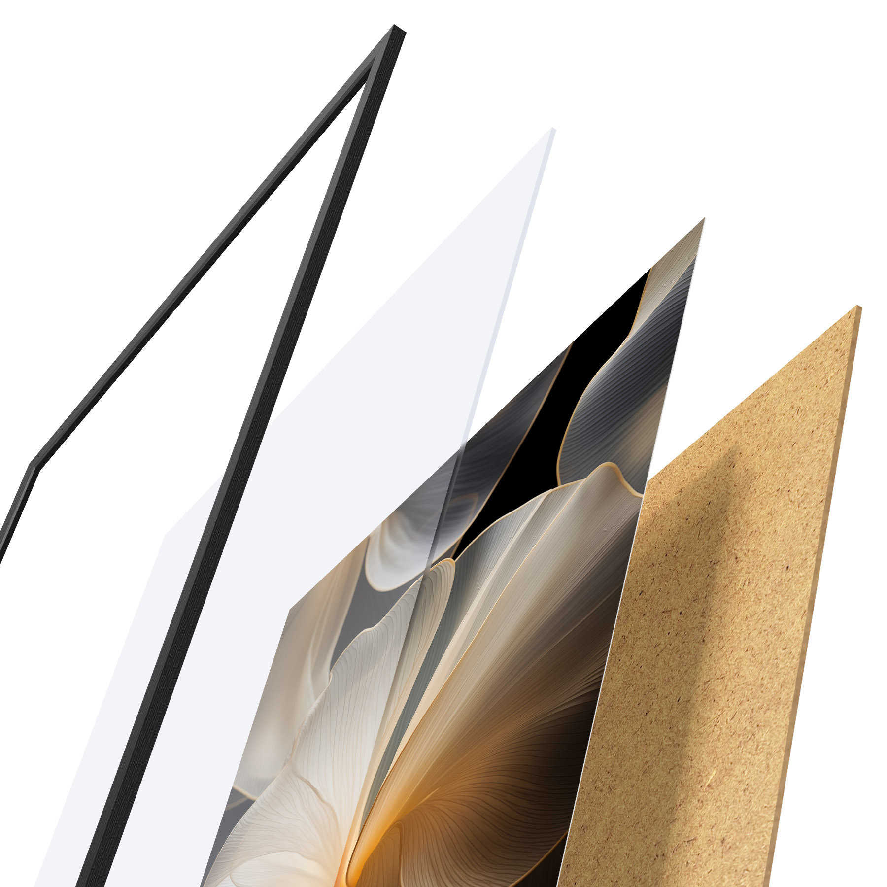 De poster bestaat uit een frame, plexiglas, geprinte afbeelding en spaanplaat achterkant. De poster kan meteen aan de muur worden gehangen dankzij de bevestigingen op de achterkant.