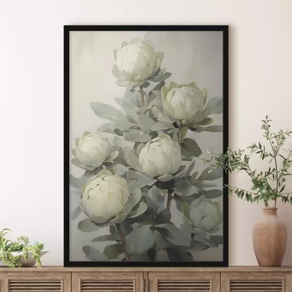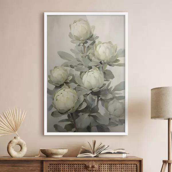 Poster Schilderstijl van verschillende witte proteabloemen met grote groene bladeren tegen een lichte achtergrond f47861