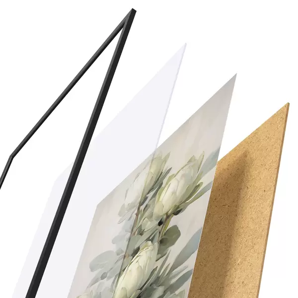 De poster bestaat uit een frame, plexiglas, geprinte afbeelding en spaanplaat achterkant. De poster kan meteen aan de muur worden gehangen dankzij de bevestigingen op de achterkant.