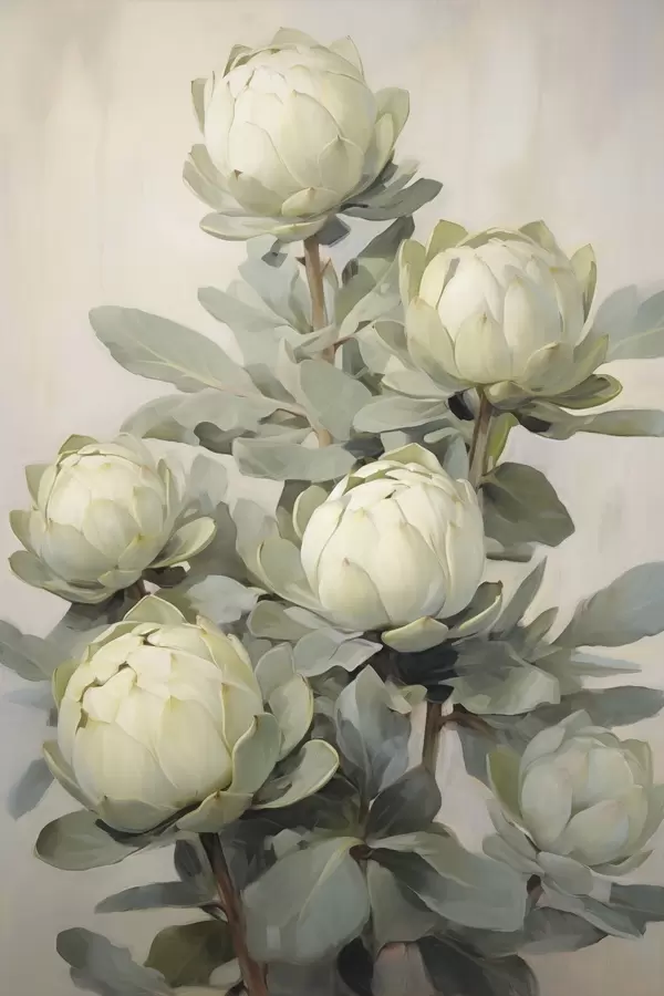 Poster Schilderstijl van verschillende witte proteabloemen met grote groene bladeren tegen een lichte achtergrond f47861