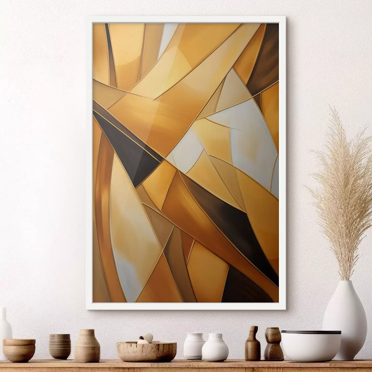 Poster Abstracte geometrische vormen in tinten oranje, bruin en wit met dunne contouren op een gestructureerde achtergrond N° f47863