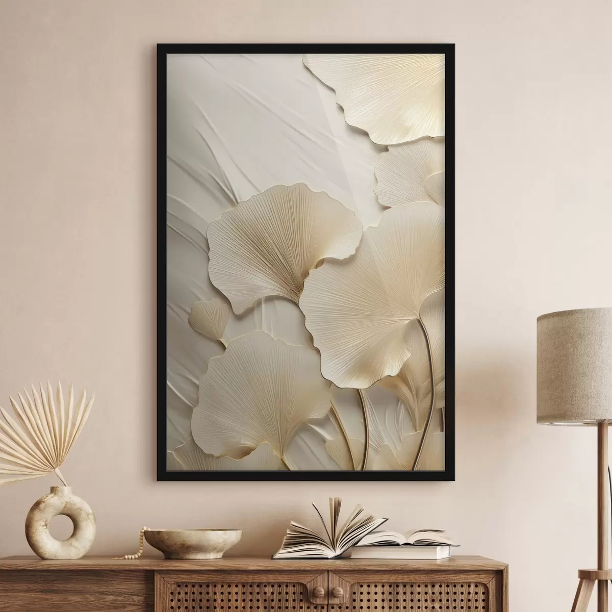 Poster Ginkgo-bladeren tegen een gestructureerde, lichte achtergrond, elegante en abstracte compositie N° f47867