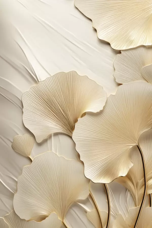 Poster Ginkgo-bladeren tegen een gestructureerde, lichte achtergrond, elegante en abstracte compositie N° f47867