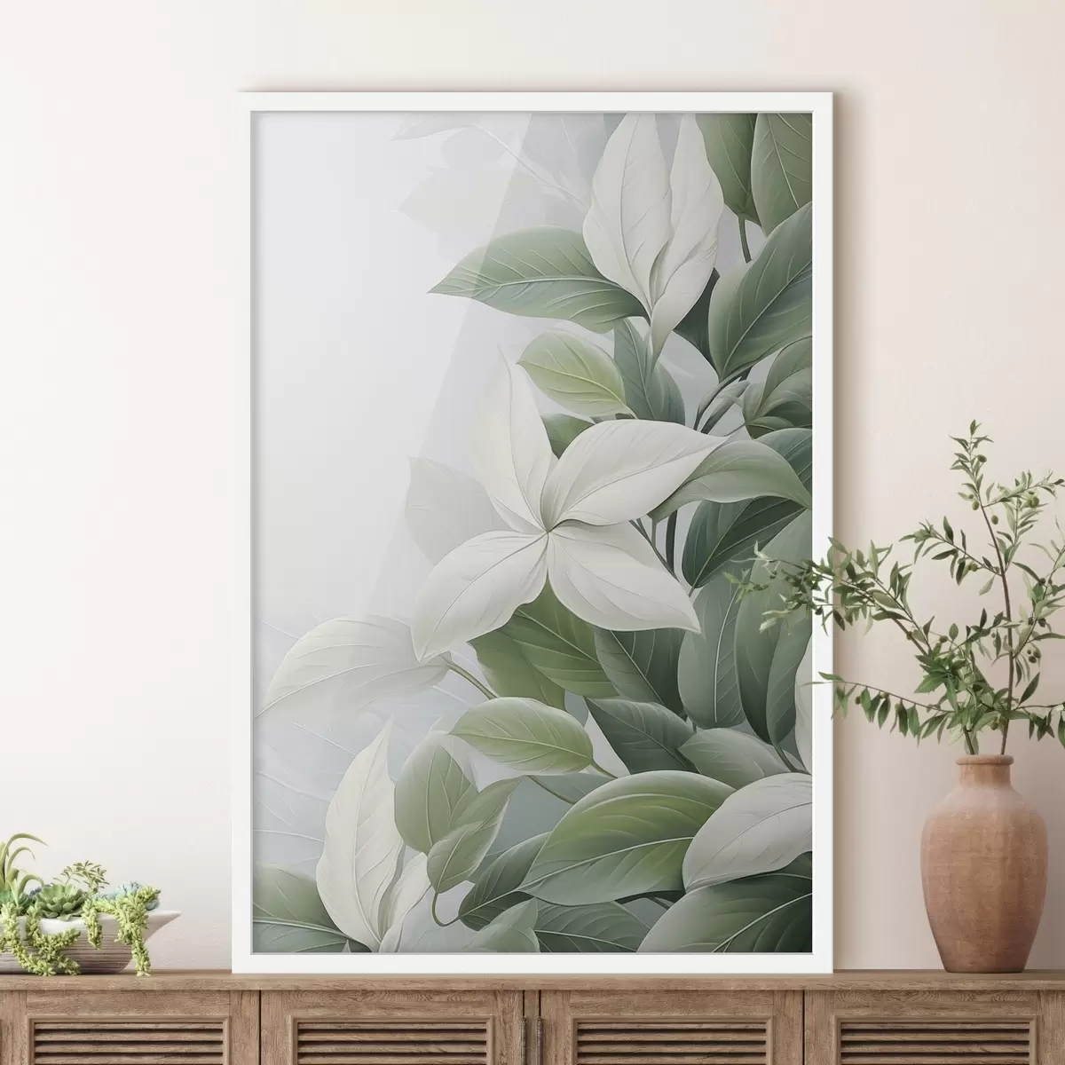 Poster Witte bloemen met groene bladeren, pastelkleurige achtergrond N° f47870
