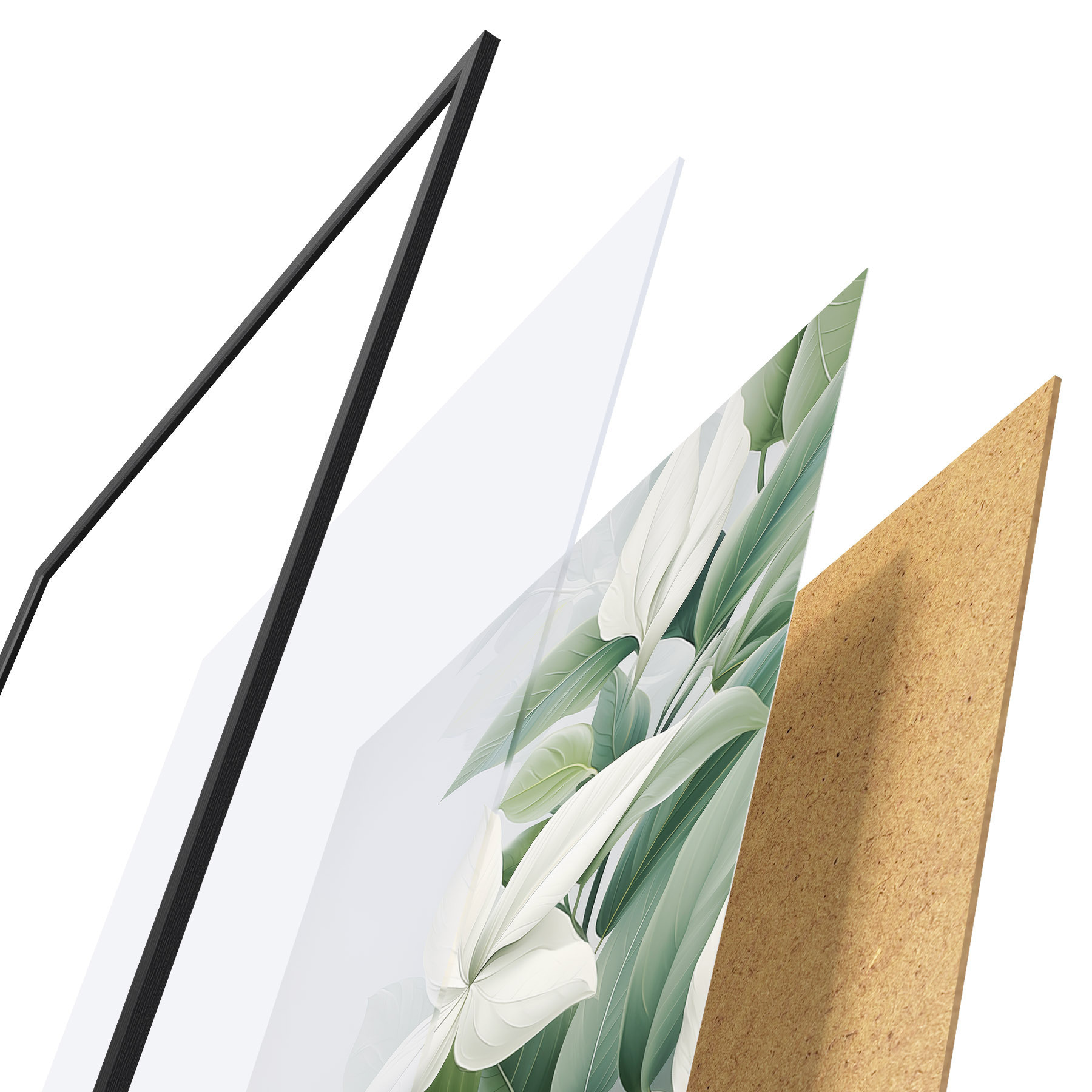 De poster bestaat uit een frame, plexiglas, geprinte afbeelding en spaanplaat achterkant. De poster kan meteen aan de muur worden gehangen dankzij de bevestigingen op de achterkant.