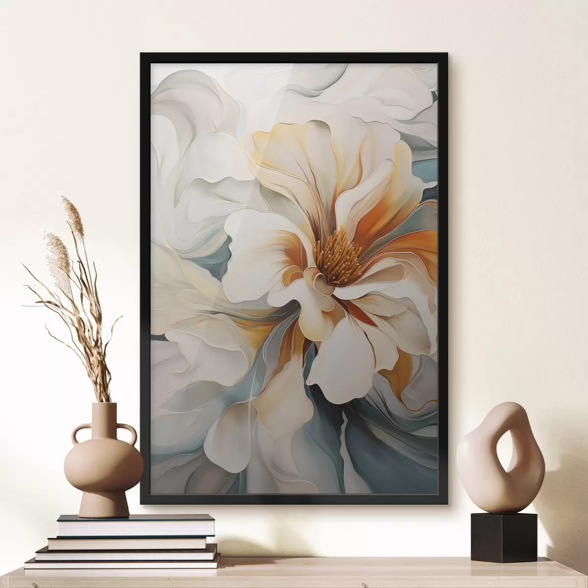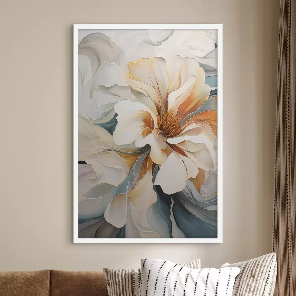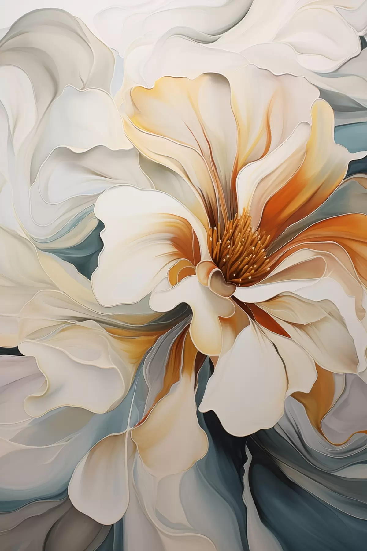 Poster Abstracte grote bloem met witte, oranje en blauwgroene bloemblaadjes, gestructureerde achtergrond N° f47877