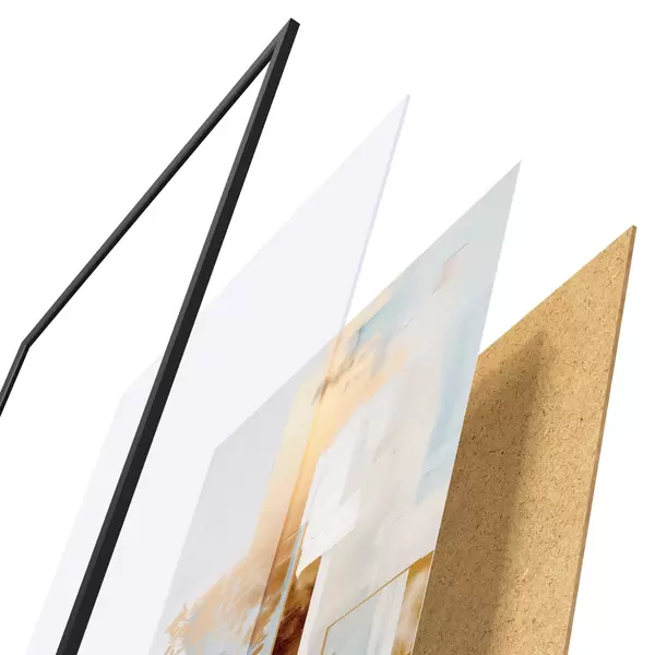 De poster bestaat uit een frame, plexiglas, geprinte afbeelding en spaanplaat achterkant. De poster kan meteen aan de muur worden gehangen dankzij de bevestigingen op de achterkant.