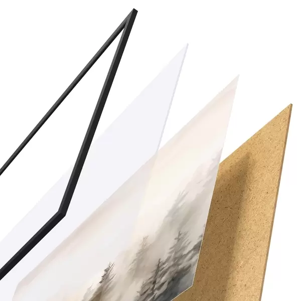 De poster bestaat uit een frame, plexiglas, geprinte afbeelding en spaanplaat achterkant. De poster kan meteen aan de muur worden gehangen dankzij de bevestigingen op de achterkant.