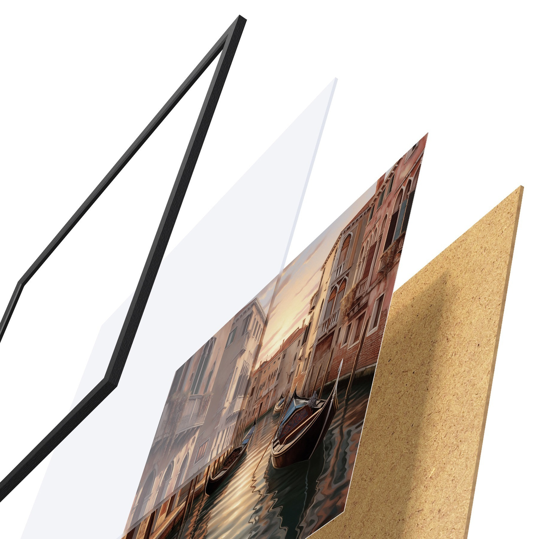 De poster bestaat uit een frame, plexiglas, geprinte afbeelding en spaanplaat achterkant. De poster kan meteen aan de muur worden gehangen dankzij de bevestigingen op de achterkant.