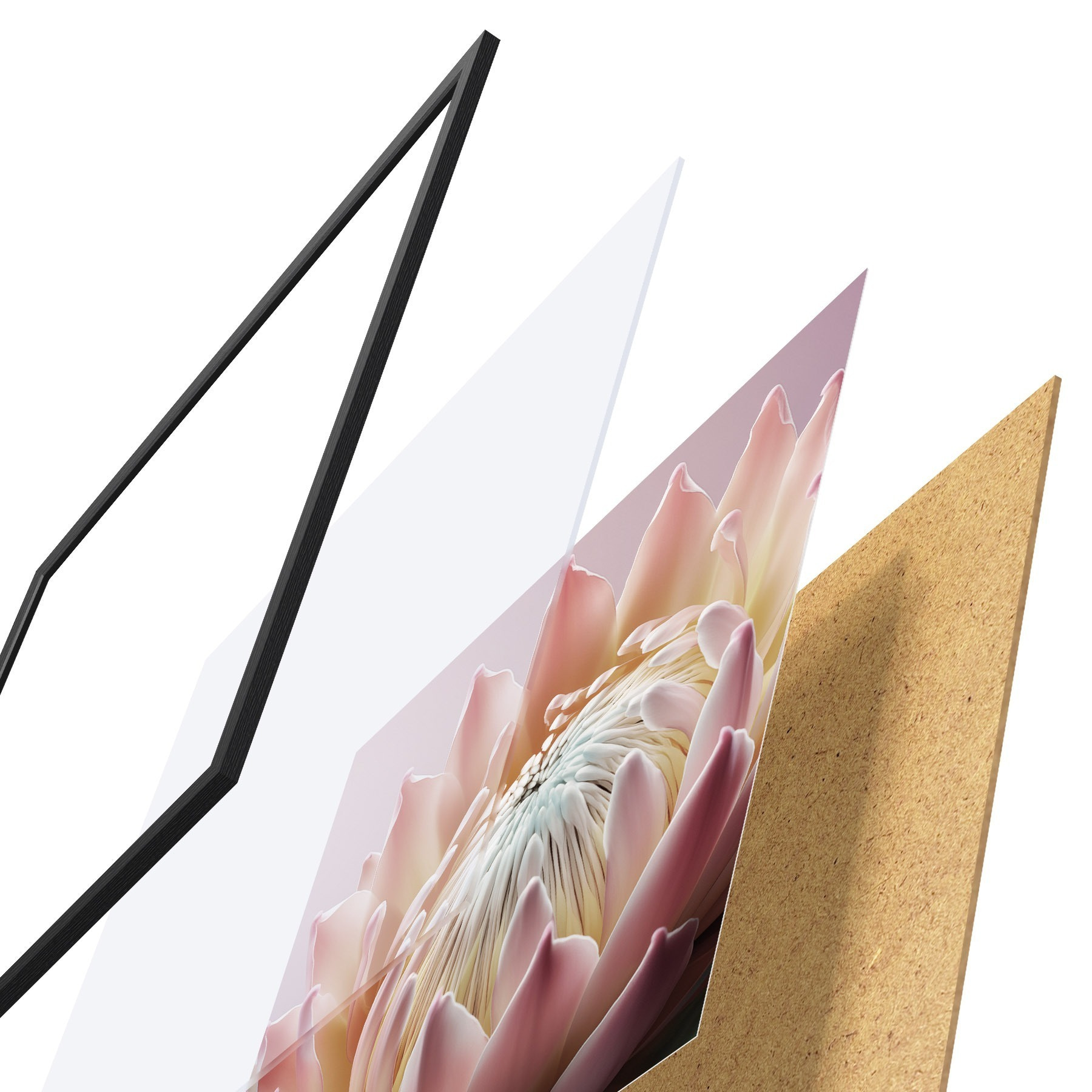 De poster bestaat uit een frame, plexiglas, geprinte afbeelding en spaanplaat achterkant. De poster kan meteen aan de muur worden gehangen dankzij de bevestigingen op de achterkant.