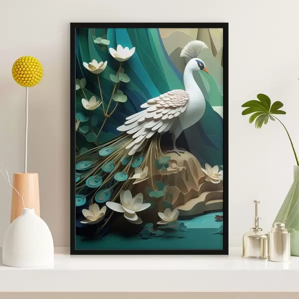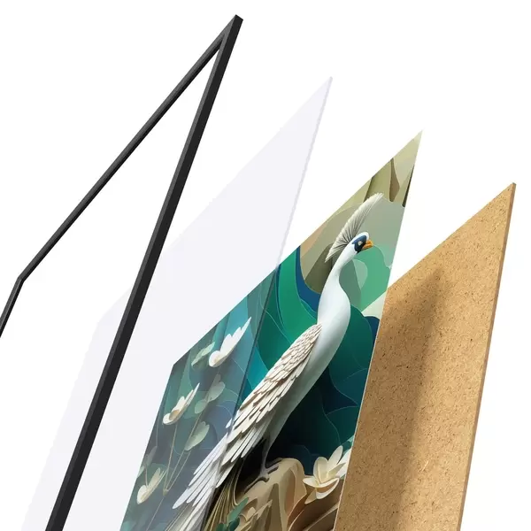 De poster bestaat uit een frame, plexiglas, geprinte afbeelding en spaanplaat achterkant. De poster kan meteen aan de muur worden gehangen dankzij de bevestigingen op de achterkant.