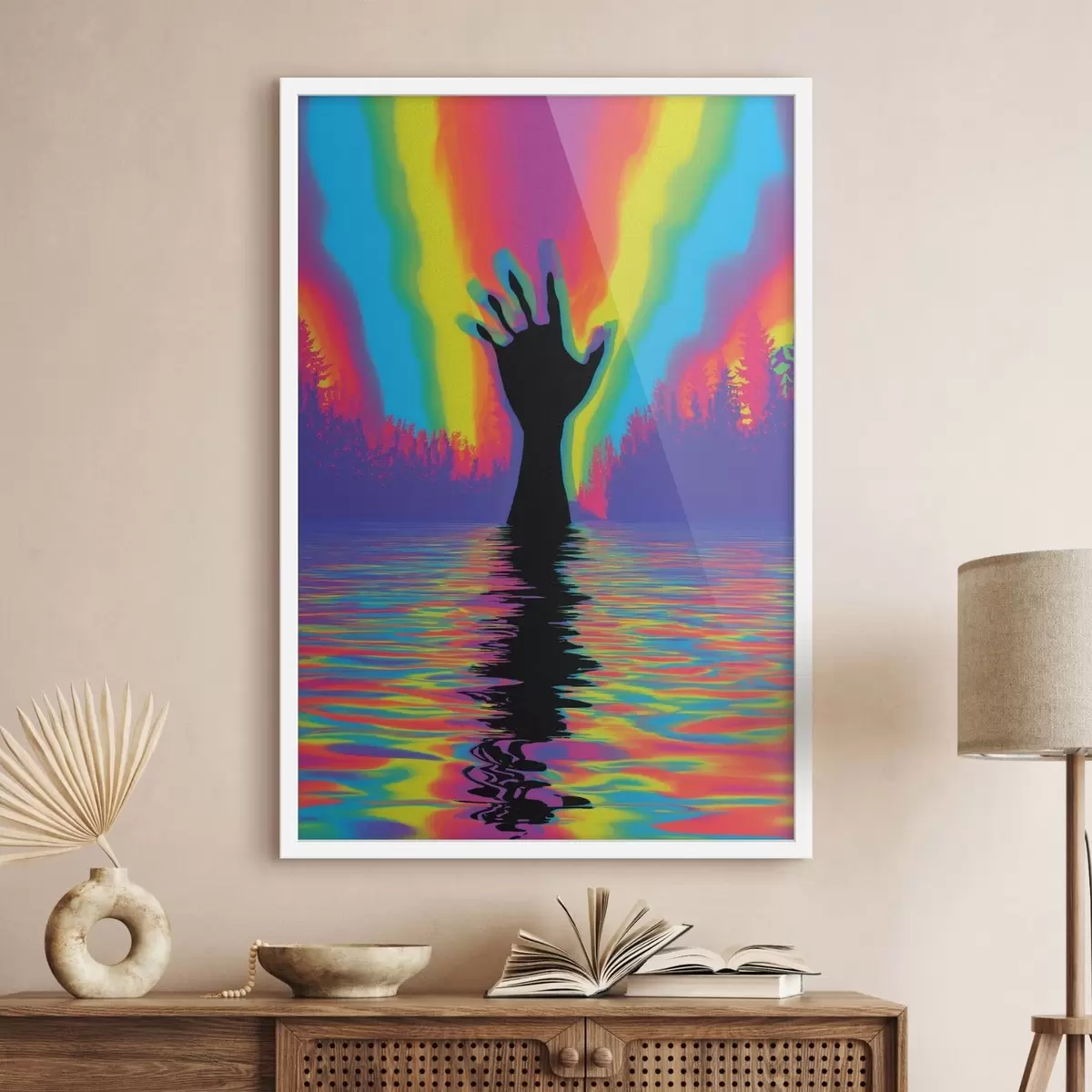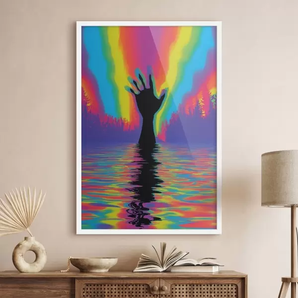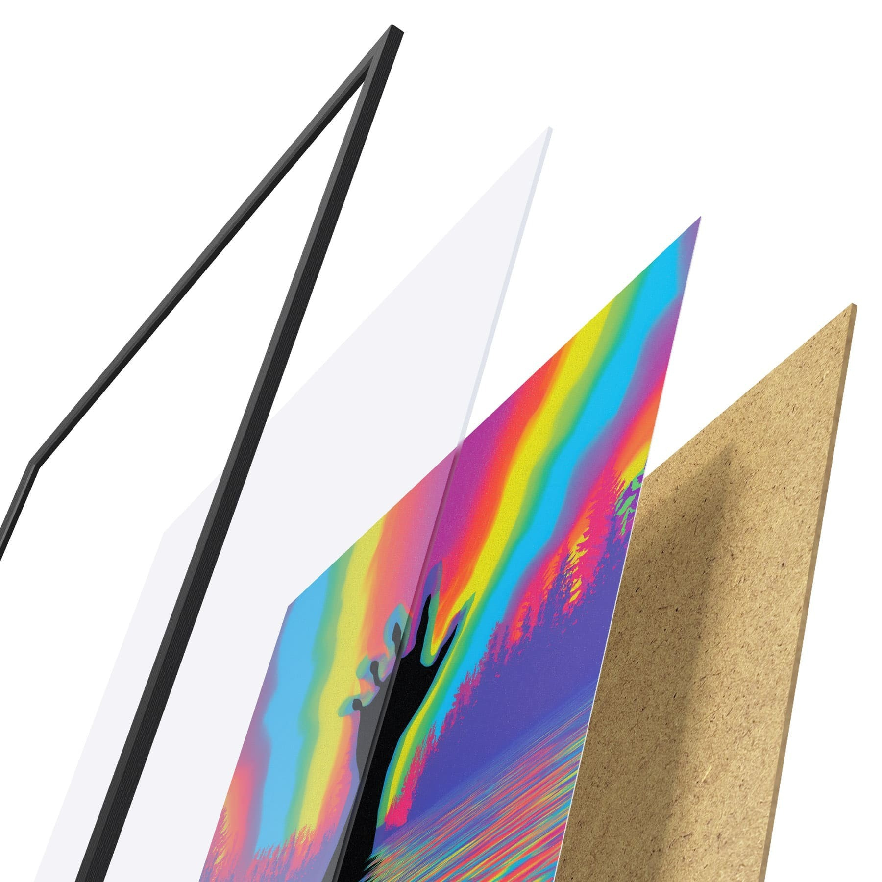 De poster bestaat uit een frame, plexiglas, geprinte afbeelding en spaanplaat achterkant. De poster kan meteen aan de muur worden gehangen dankzij de bevestigingen op de achterkant.