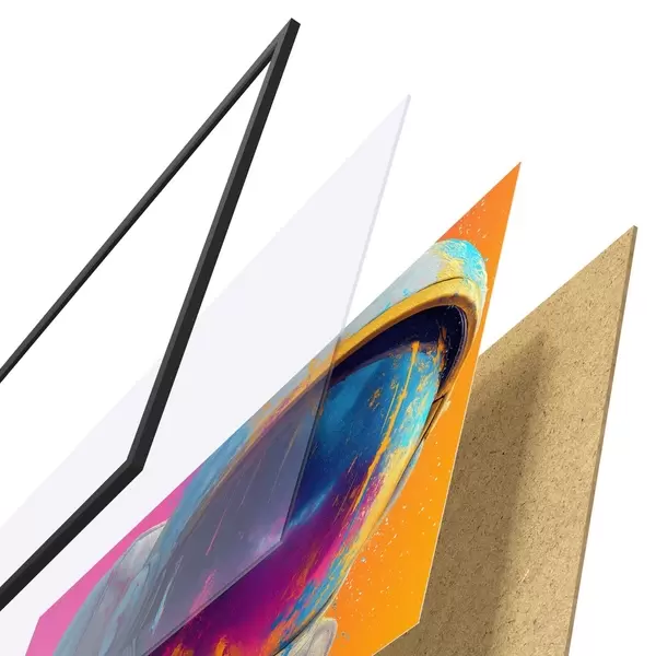 De poster bestaat uit een frame, plexiglas, geprinte afbeelding en spaanplaat achterkant. De poster kan meteen aan de muur worden gehangen dankzij de bevestigingen op de achterkant.