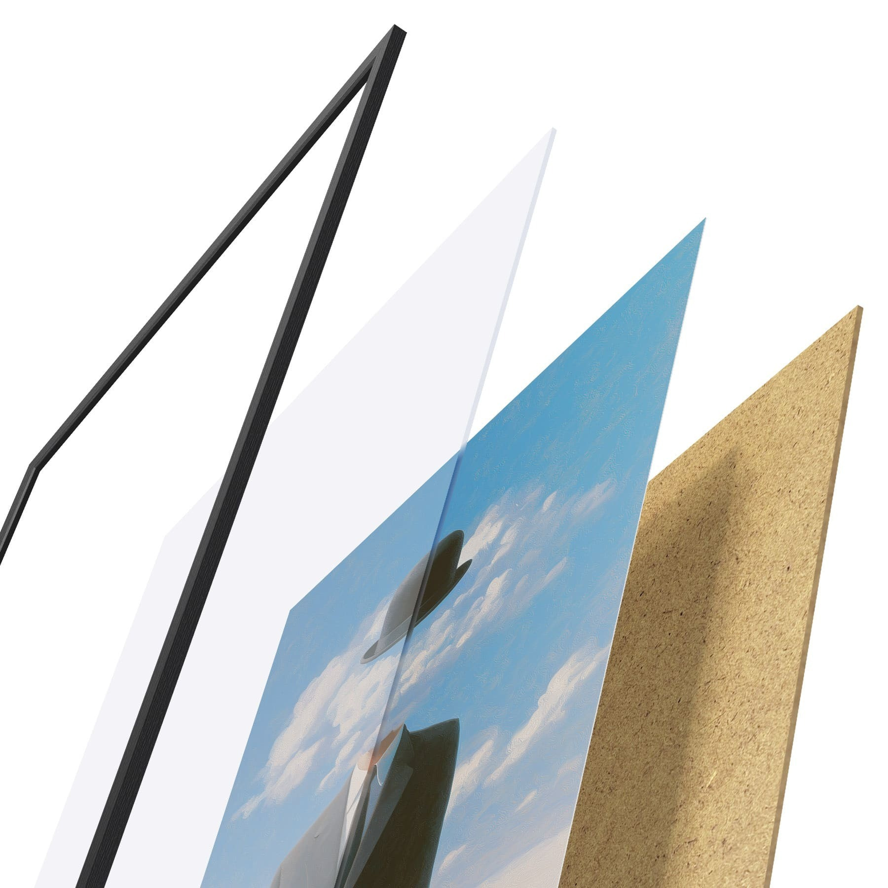 De poster bestaat uit een frame, plexiglas, geprinte afbeelding en spaanplaat achterkant. De poster kan meteen aan de muur worden gehangen dankzij de bevestigingen op de achterkant.