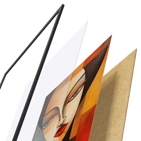 De poster bestaat uit een frame, plexiglas, geprinte afbeelding en spaanplaat achterkant. De poster kan meteen aan de muur worden gehangen dankzij de bevestigingen op de achterkant.