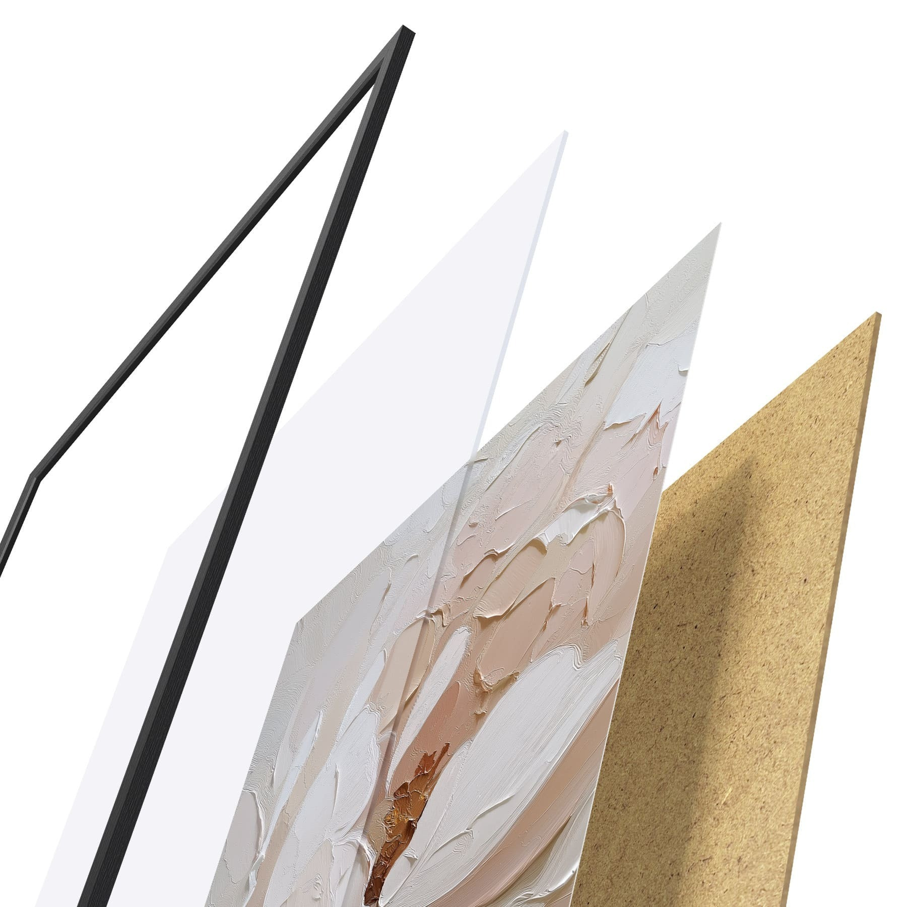De poster bestaat uit een frame, plexiglas, geprinte afbeelding en spaanplaat achterkant. De poster kan meteen aan de muur worden gehangen dankzij de bevestigingen op de achterkant.