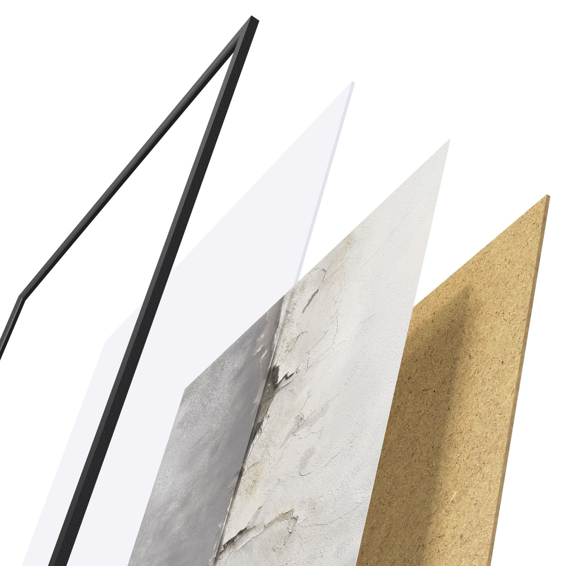 De poster bestaat uit een frame, plexiglas, geprinte afbeelding en spaanplaat achterkant. De poster kan meteen aan de muur worden gehangen dankzij de bevestigingen op de achterkant.