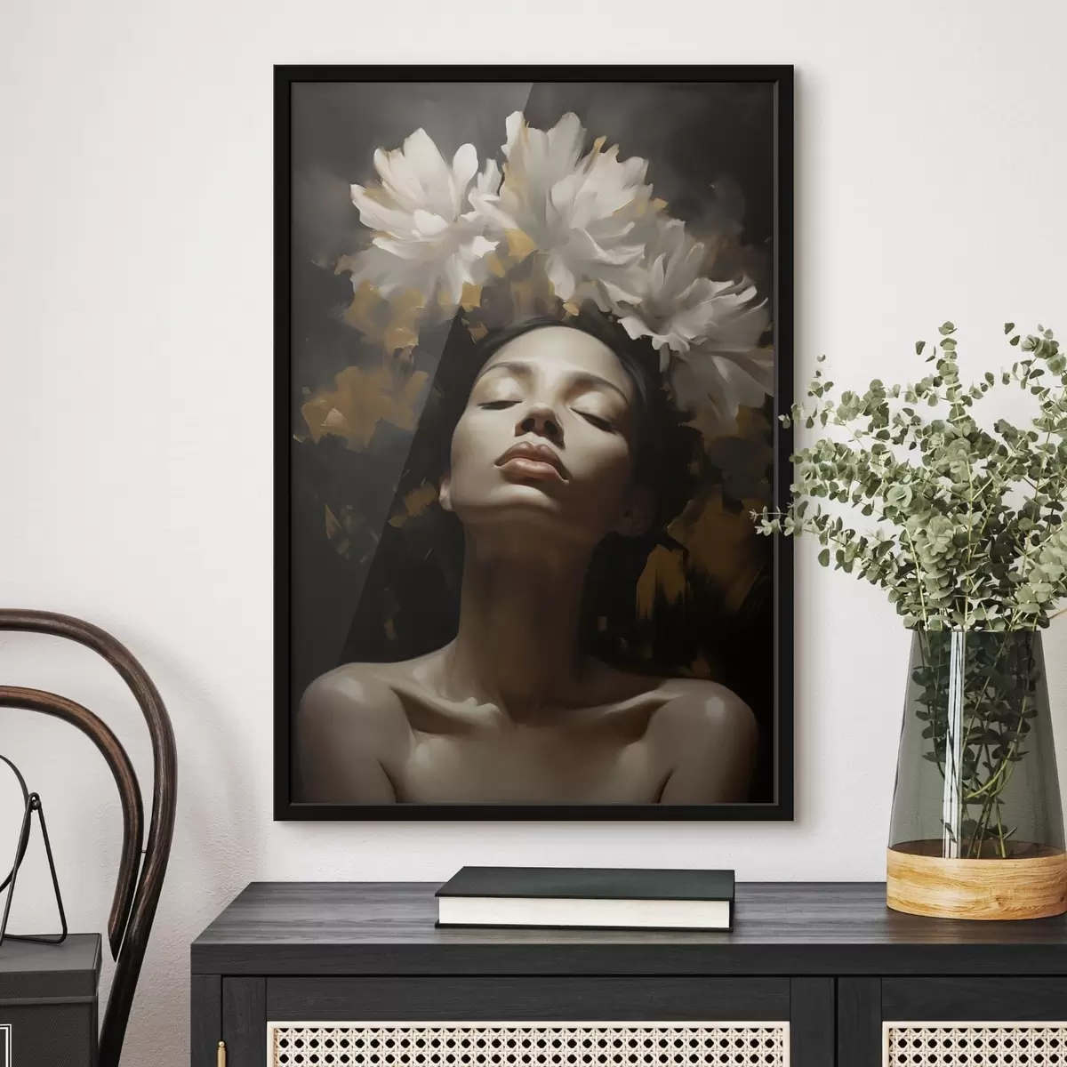 Poster Vrouwenportret met witte bloemen f47918