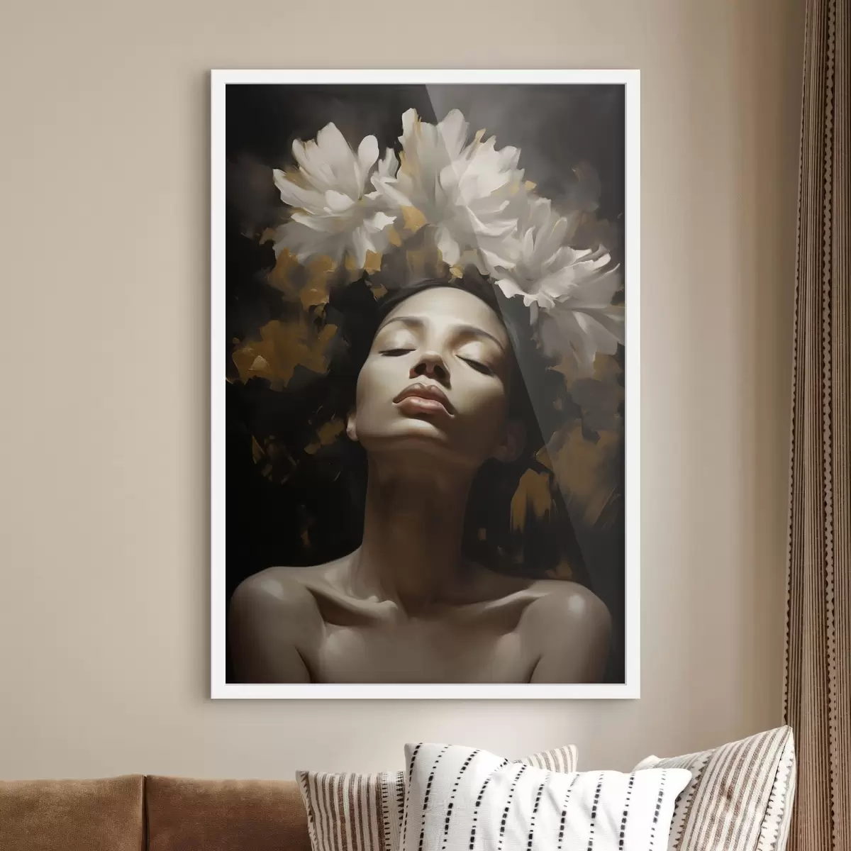 Poster Vrouwenportret met witte bloemen N° f47918