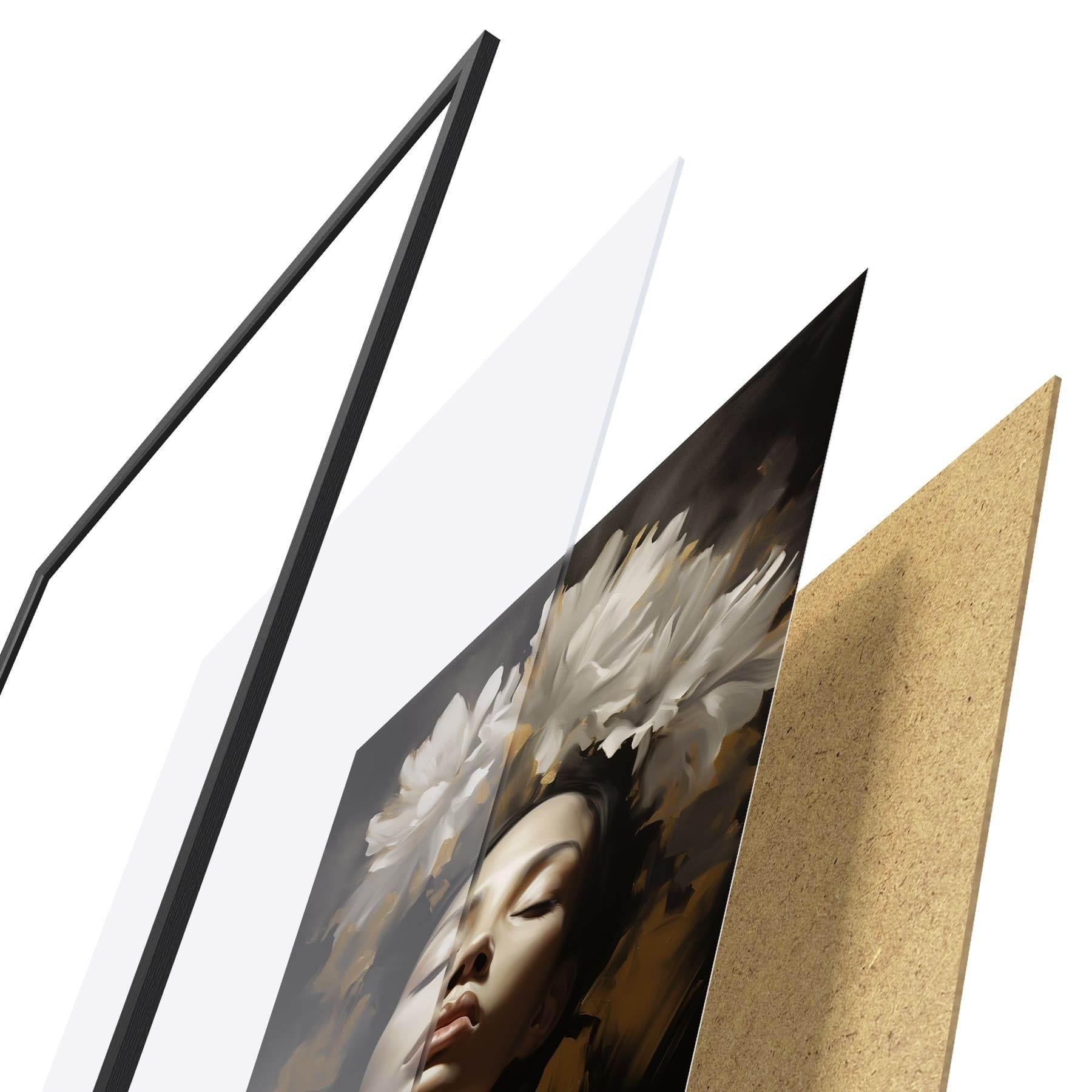 De poster bestaat uit een frame, plexiglas, geprinte afbeelding en spaanplaat achterkant. De poster kan meteen aan de muur worden gehangen dankzij de bevestigingen op de achterkant.