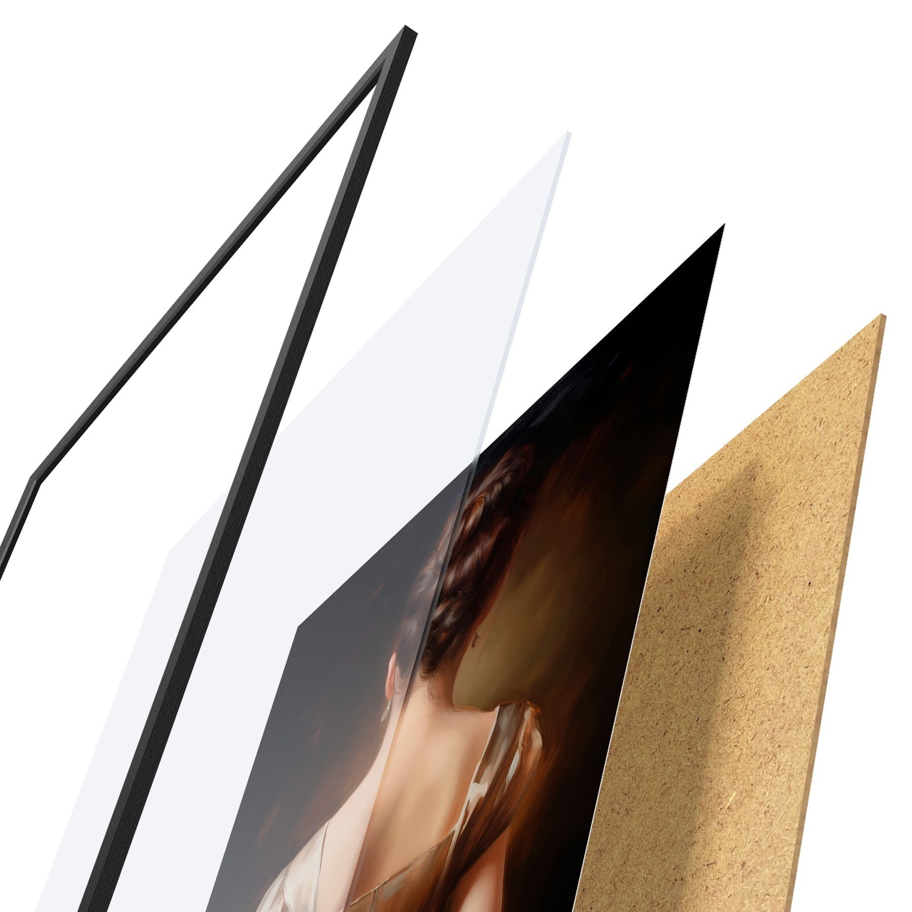 De poster bestaat uit een frame, plexiglas, geprinte afbeelding en spaanplaat achterkant. De poster kan meteen aan de muur worden gehangen dankzij de bevestigingen op de achterkant.