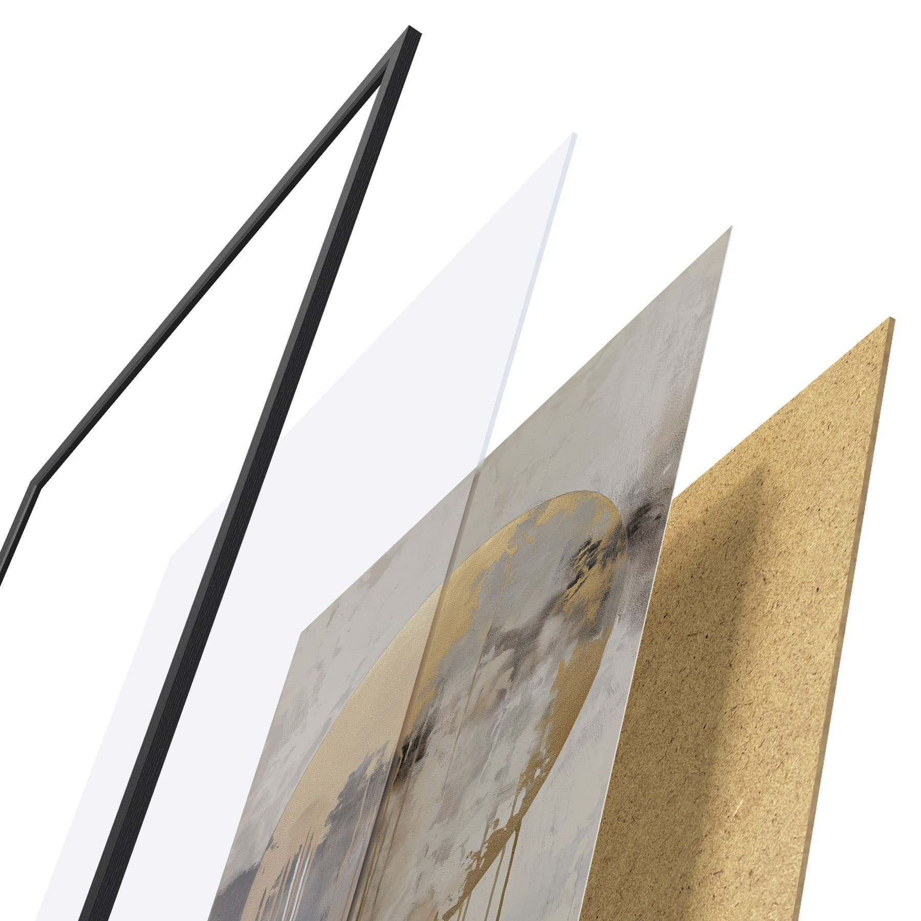 De poster bestaat uit een frame, plexiglas, geprinte afbeelding en spaanplaat achterkant. De poster kan meteen aan de muur worden gehangen dankzij de bevestigingen op de achterkant.