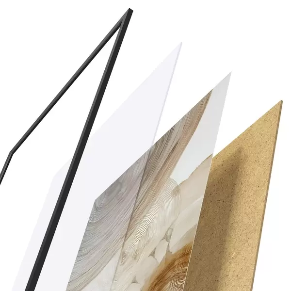 De poster bestaat uit een frame, plexiglas, geprinte afbeelding en spaanplaat achterkant. De poster kan meteen aan de muur worden gehangen dankzij de bevestigingen op de achterkant.