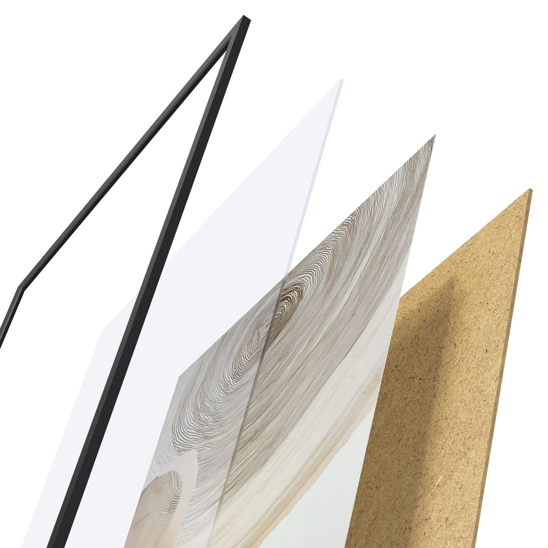 De poster bestaat uit een frame, plexiglas, geprinte afbeelding en spaanplaat achterkant. De poster kan meteen aan de muur worden gehangen dankzij de bevestigingen op de achterkant.