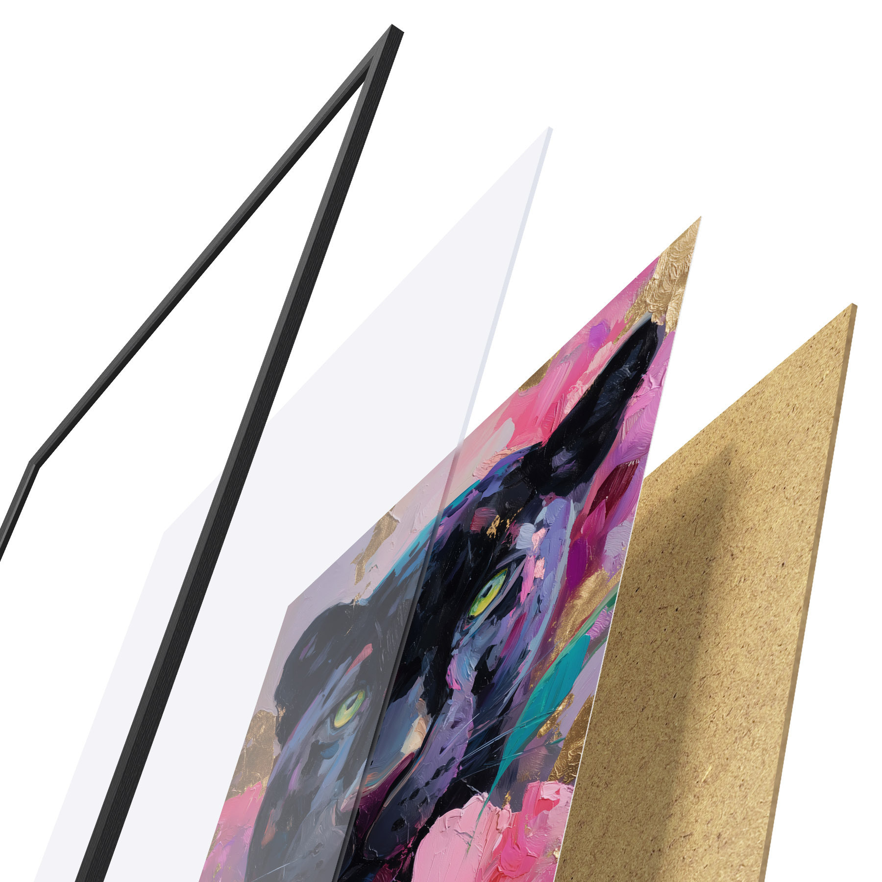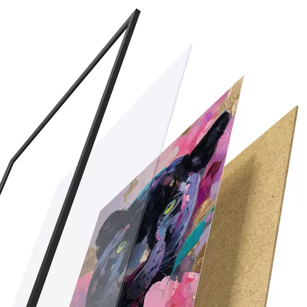 De poster bestaat uit een frame, plexiglas, geprinte afbeelding en spaanplaat achterkant. De poster kan meteen aan de muur worden gehangen dankzij de bevestigingen op de achterkant.