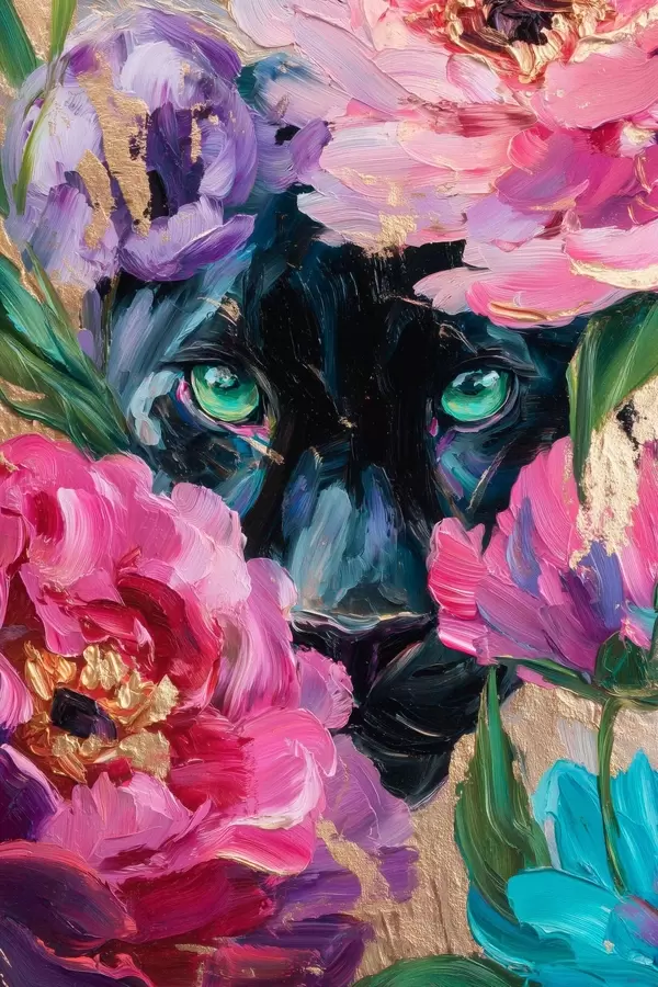 Poster een zwarte panter gluurt tussen de pioenrozen N° f47936