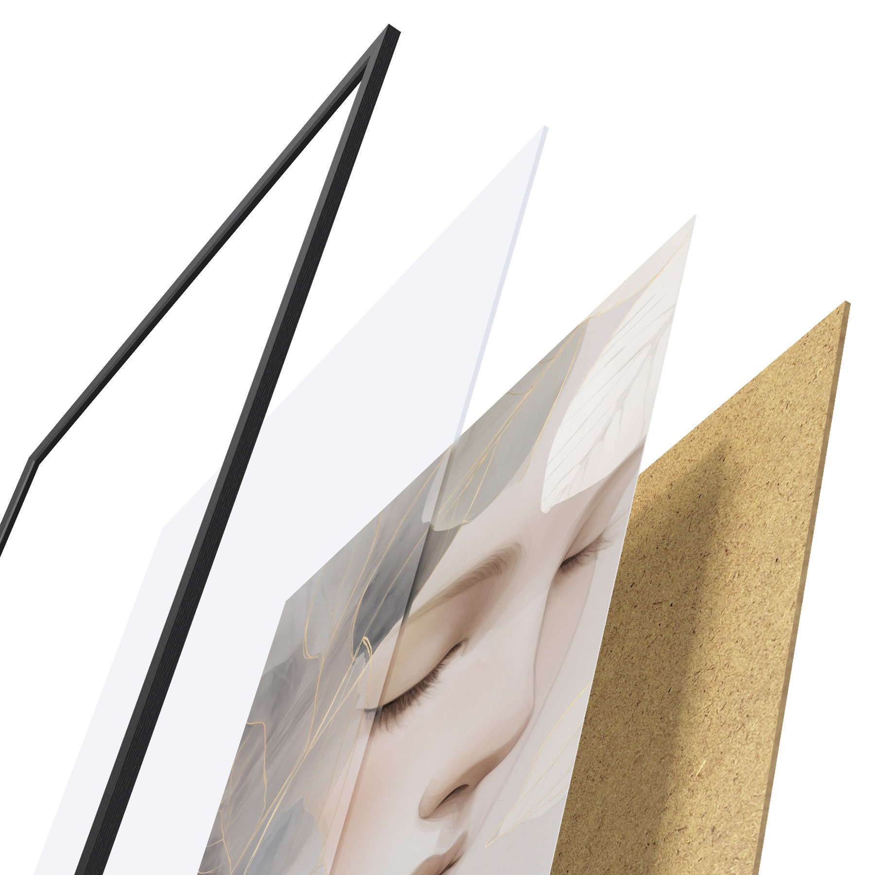 De poster bestaat uit een frame, plexiglas, geprinte afbeelding en spaanplaat achterkant. De poster kan meteen aan de muur worden gehangen dankzij de bevestigingen op de achterkant.