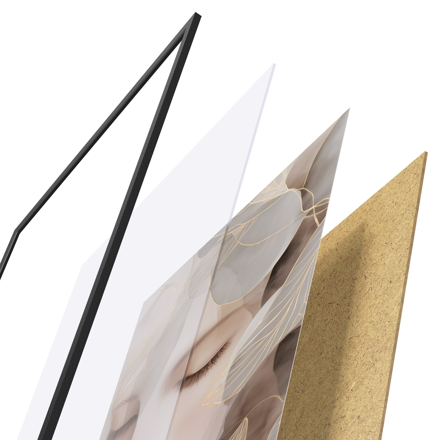 De poster bestaat uit een frame, plexiglas, geprinte afbeelding en spaanplaat achterkant. De poster kan meteen aan de muur worden gehangen dankzij de bevestigingen op de achterkant.