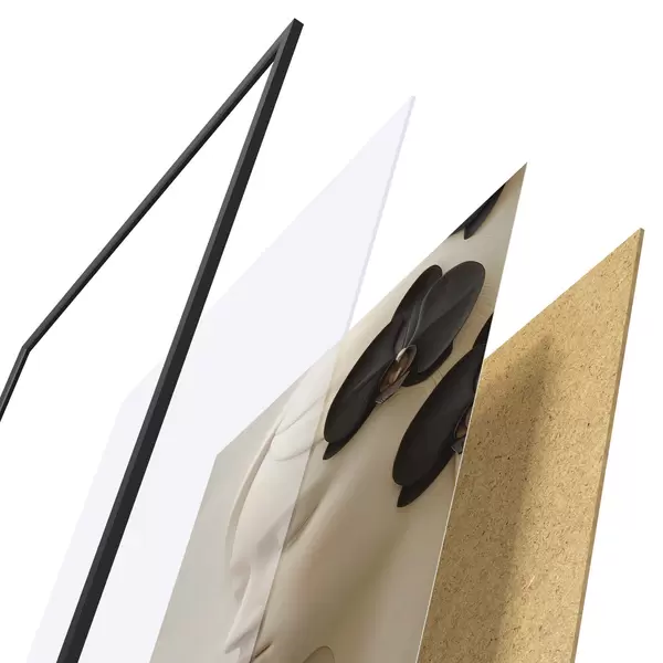 De poster bestaat uit een frame, plexiglas, geprinte afbeelding en spaanplaat achterkant. De poster kan meteen aan de muur worden gehangen dankzij de bevestigingen op de achterkant.
