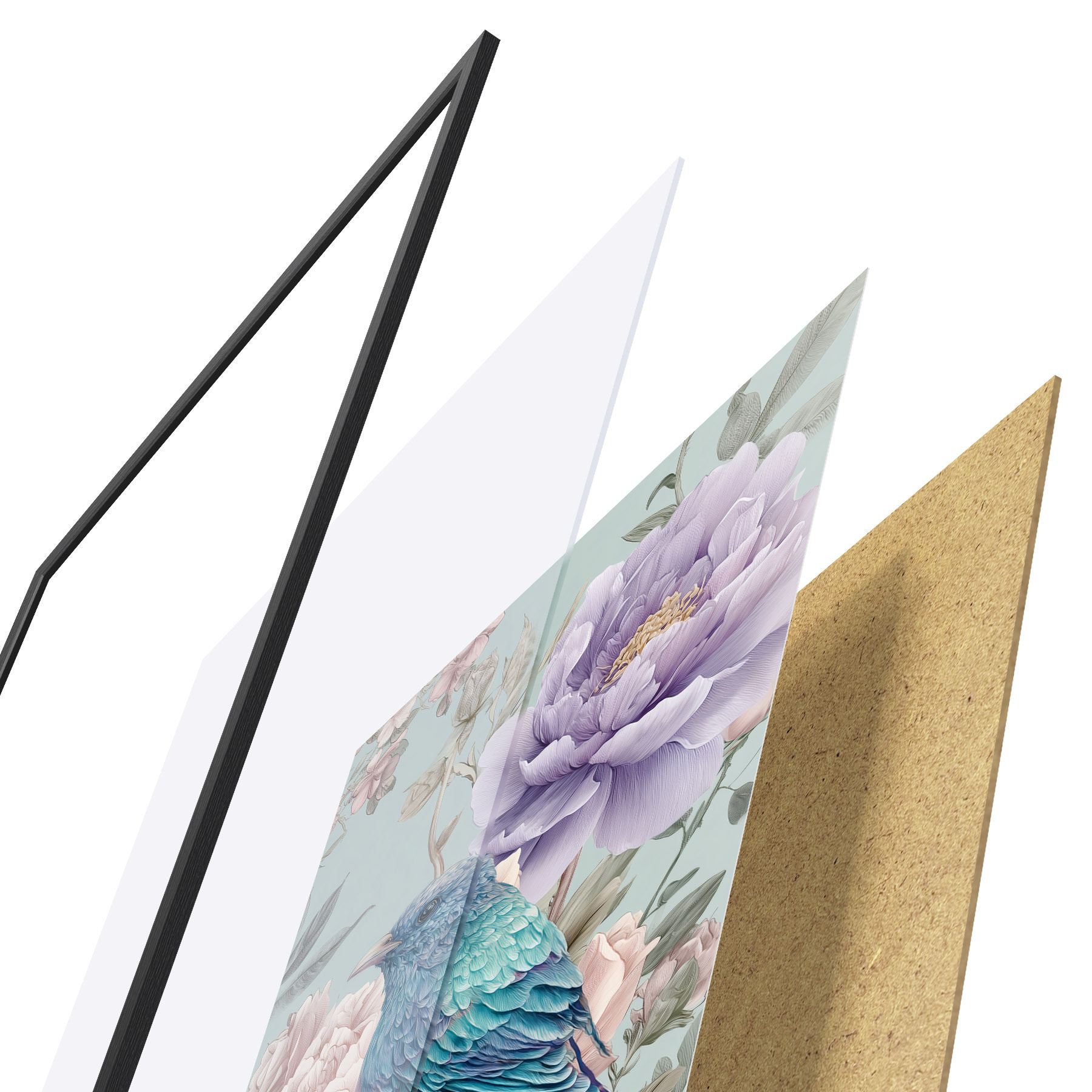 De poster bestaat uit een frame, plexiglas, geprinte afbeelding en spaanplaat achterkant. De poster kan meteen aan de muur worden gehangen dankzij de bevestigingen op de achterkant.