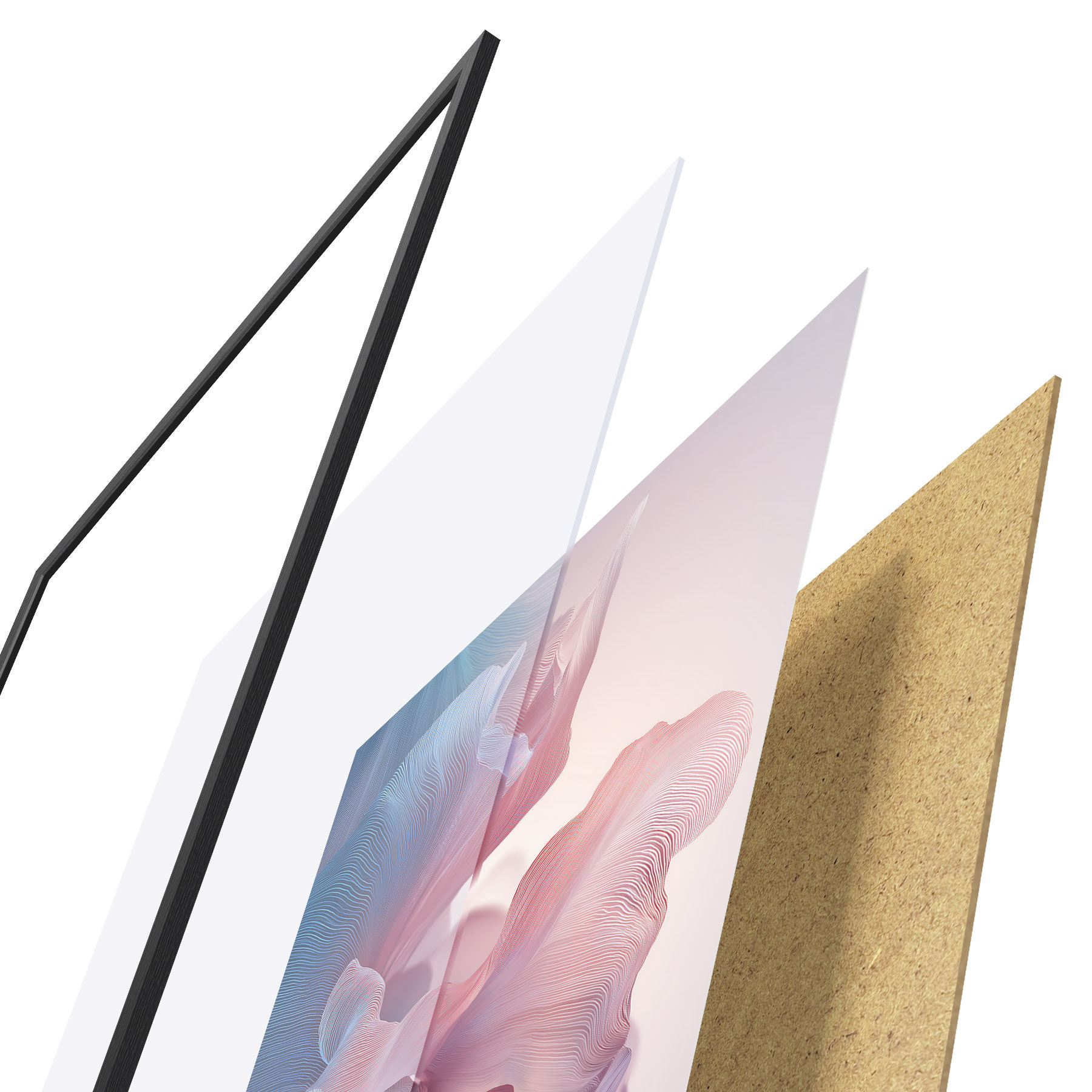 De poster bestaat uit een frame, plexiglas, geprinte afbeelding en spaanplaat achterkant. De poster kan meteen aan de muur worden gehangen dankzij de bevestigingen op de achterkant.