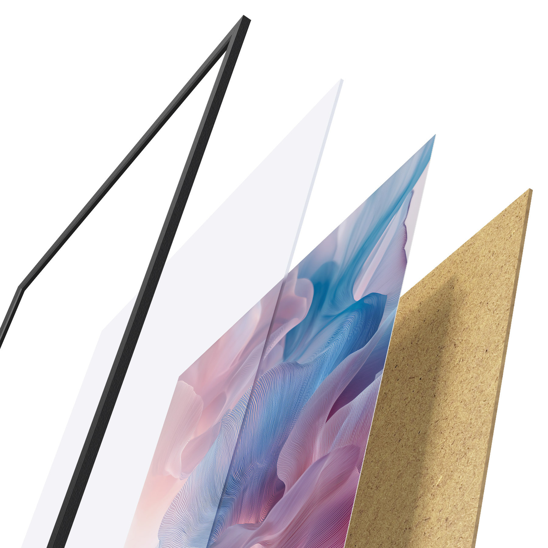 De poster bestaat uit een frame, plexiglas, geprinte afbeelding en spaanplaat achterkant. De poster kan meteen aan de muur worden gehangen dankzij de bevestigingen op de achterkant.