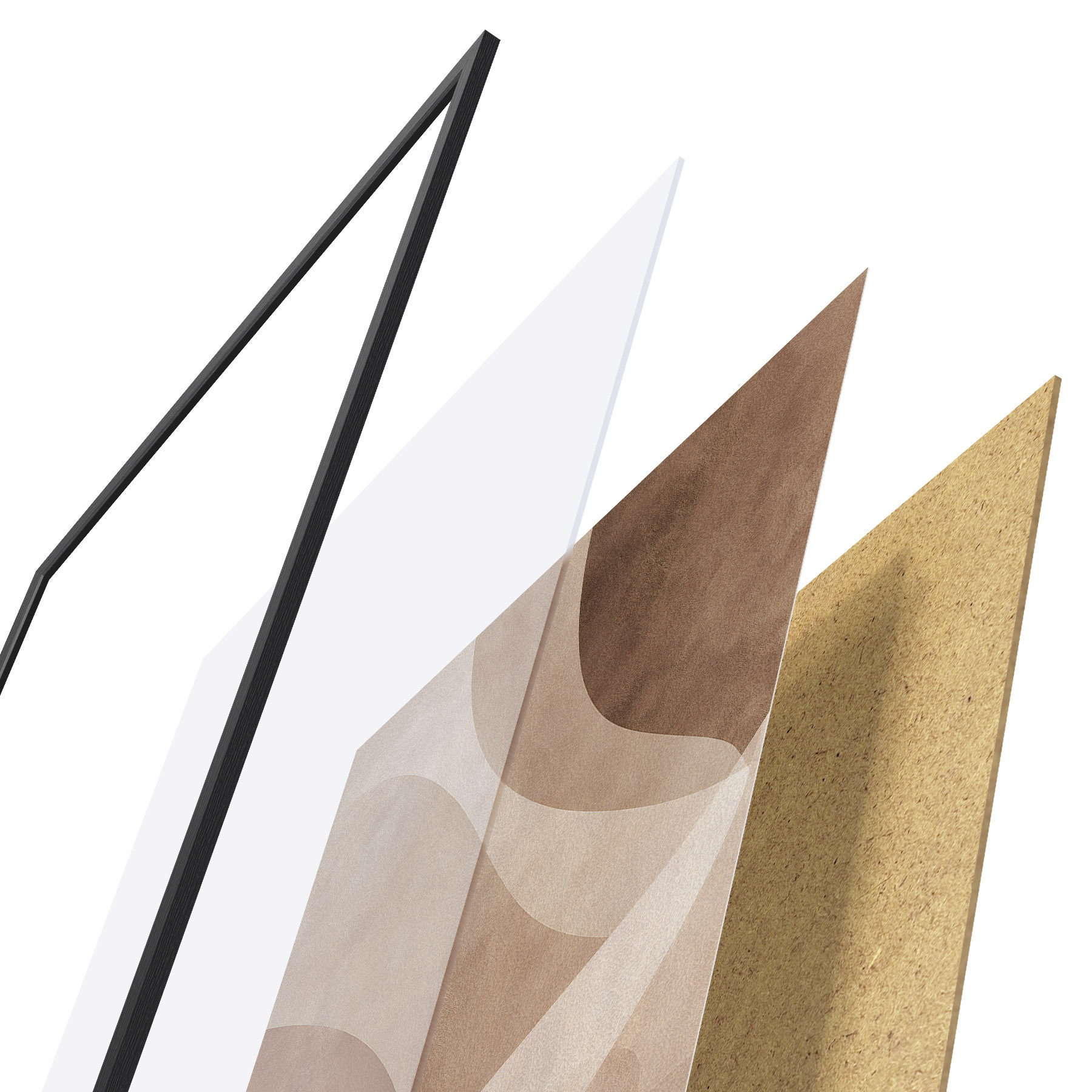 De poster bestaat uit een frame, plexiglas, geprinte afbeelding en spaanplaat achterkant. De poster kan meteen aan de muur worden gehangen dankzij de bevestigingen op de achterkant.