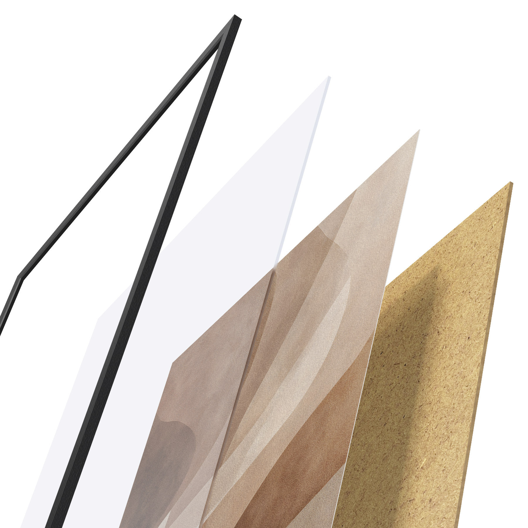 De poster bestaat uit een frame, plexiglas, geprinte afbeelding en spaanplaat achterkant. De poster kan meteen aan de muur worden gehangen dankzij de bevestigingen op de achterkant.