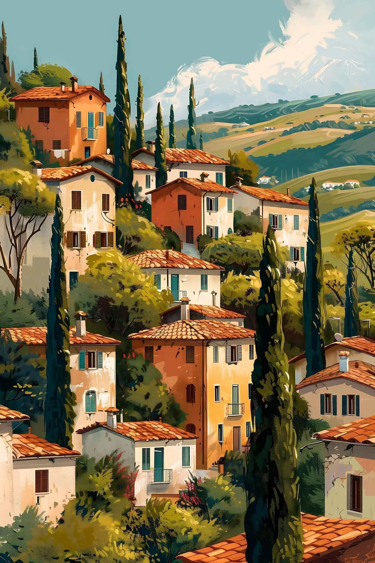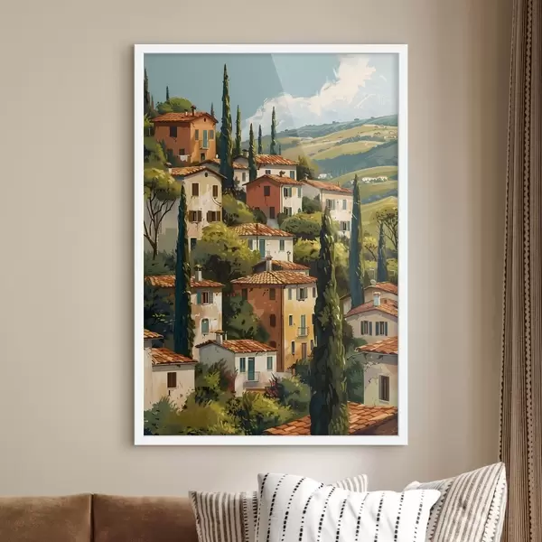 Poster mediterraan dorpje op een heuvel, met warmgekleurde huizen met terracotta daken N° f47950
