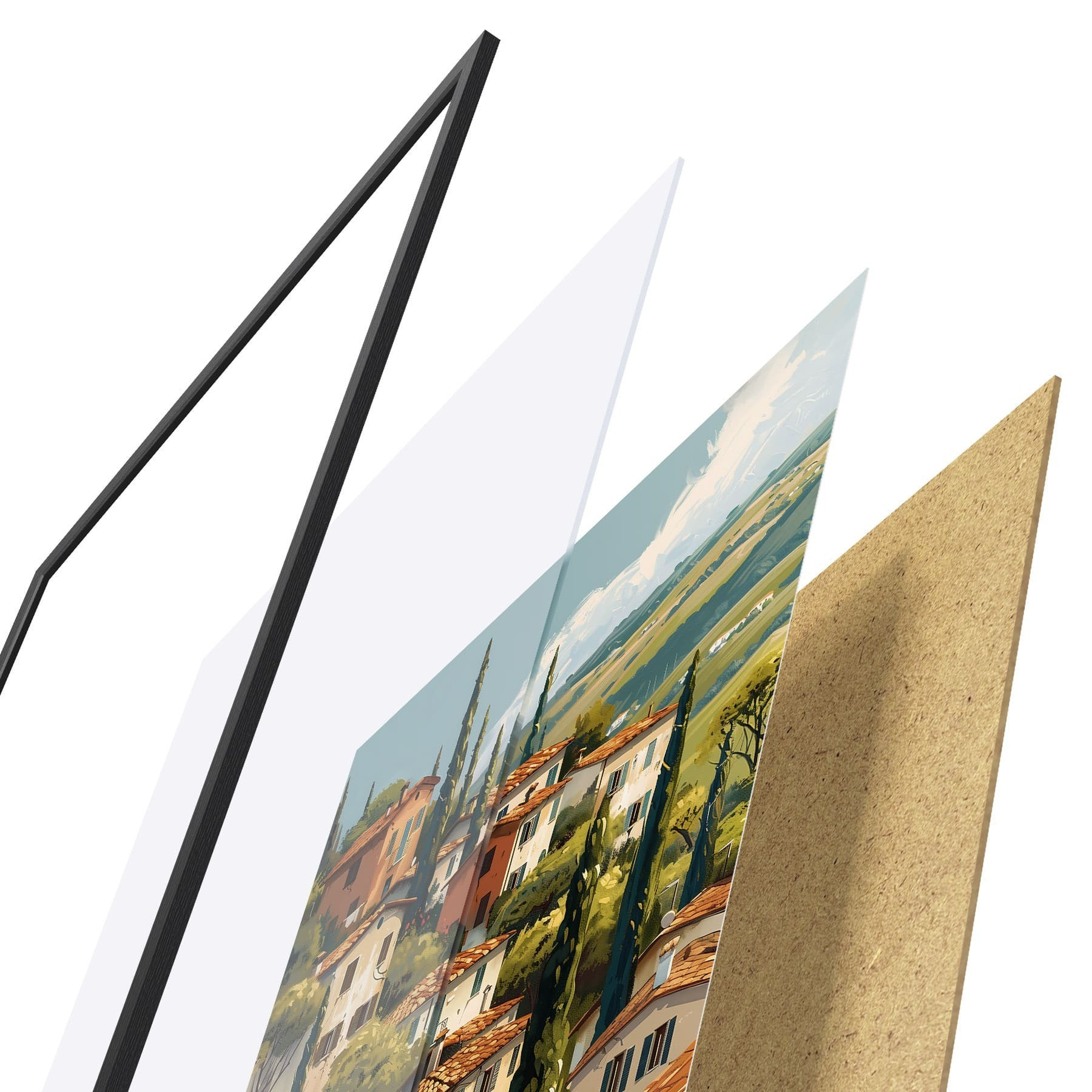 De poster bestaat uit een frame, plexiglas, geprinte afbeelding en spaanplaat achterkant. De poster kan meteen aan de muur worden gehangen dankzij de bevestigingen op de achterkant.