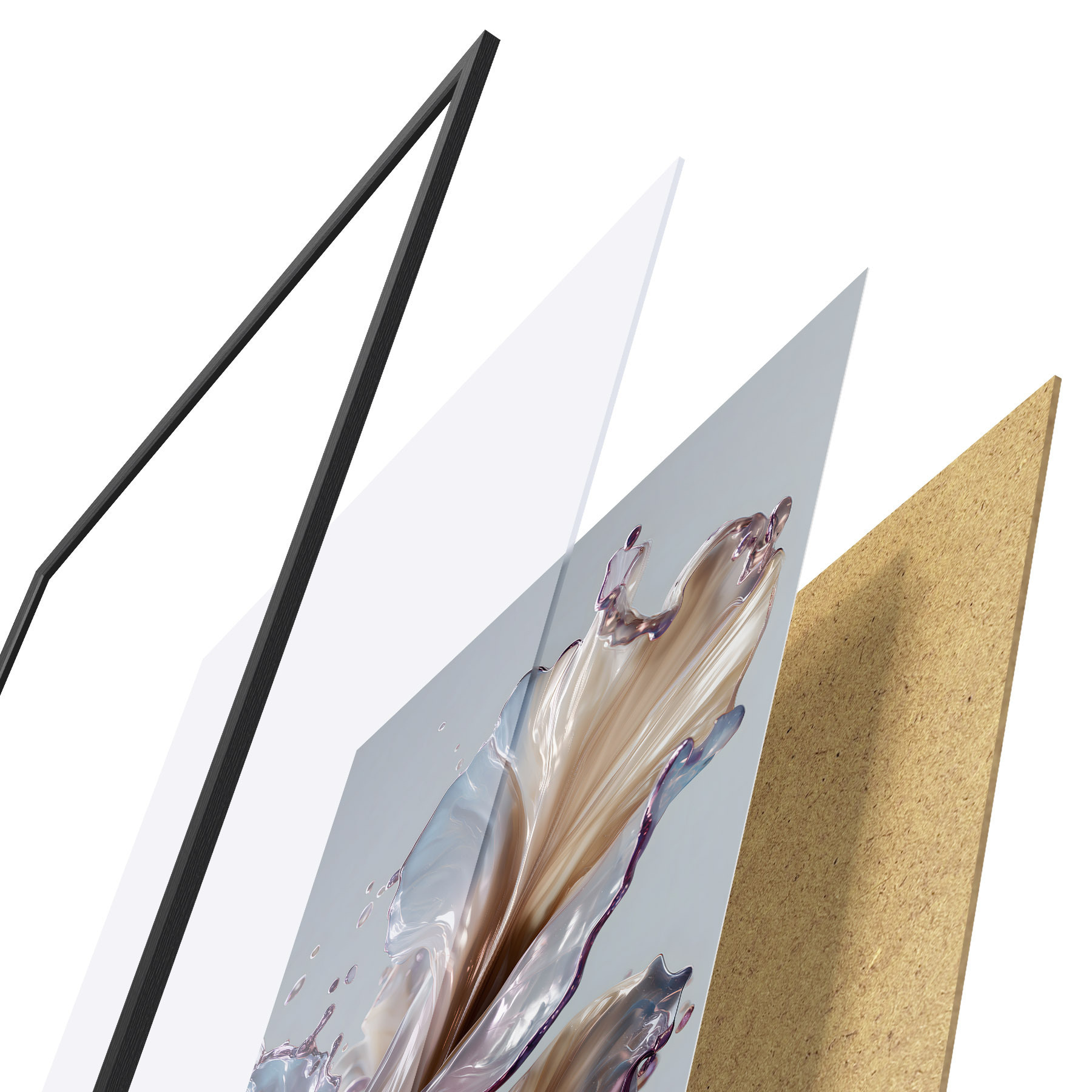 De poster bestaat uit een frame, plexiglas, geprinte afbeelding en spaanplaat achterkant. De poster kan meteen aan de muur worden gehangen dankzij de bevestigingen op de achterkant.