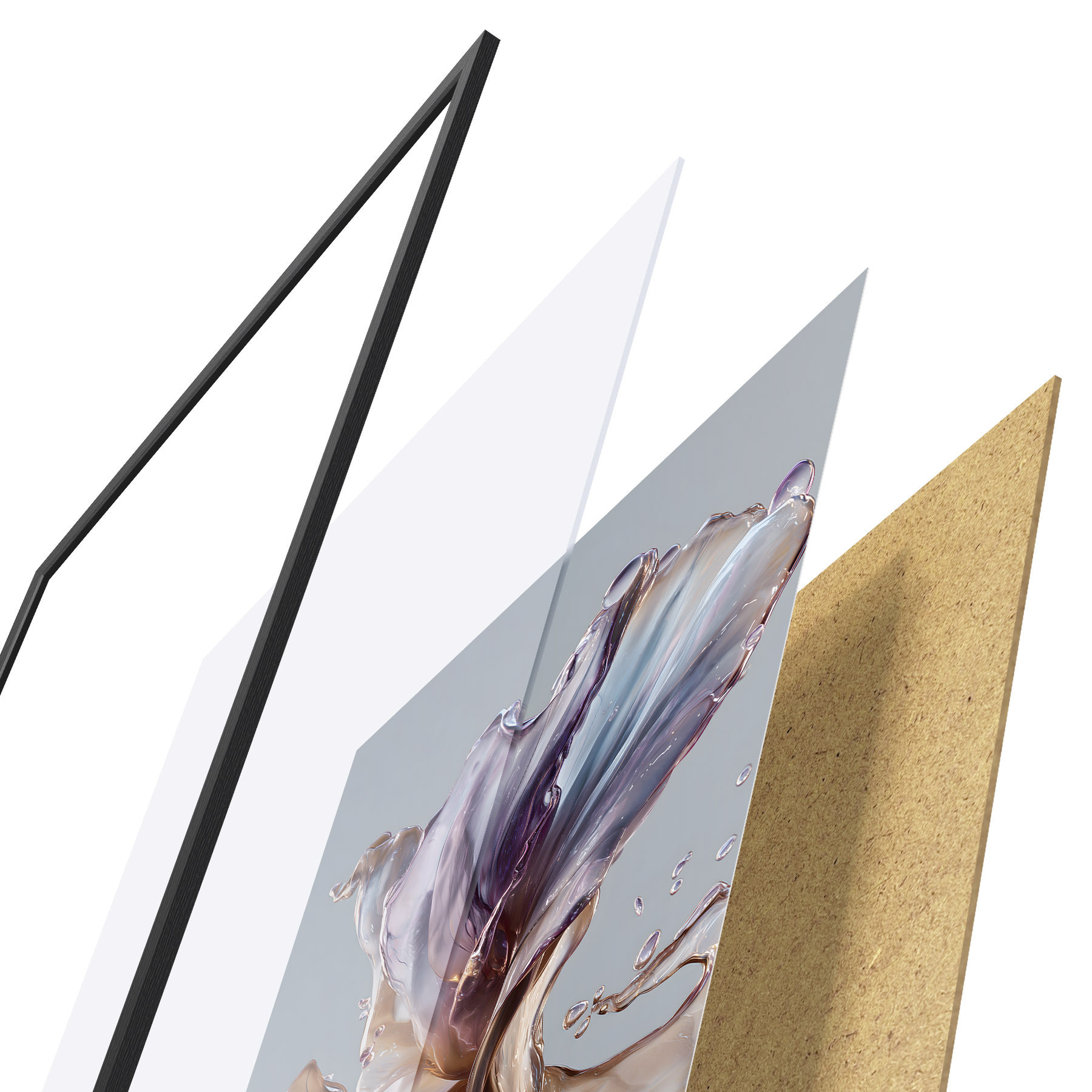 De poster bestaat uit een frame, plexiglas, geprinte afbeelding en spaanplaat achterkant. De poster kan meteen aan de muur worden gehangen dankzij de bevestigingen op de achterkant.