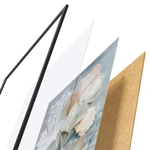 De poster bestaat uit een frame, plexiglas, geprinte afbeelding en spaanplaat achterkant. De poster kan meteen aan de muur worden gehangen dankzij de bevestigingen op de achterkant.