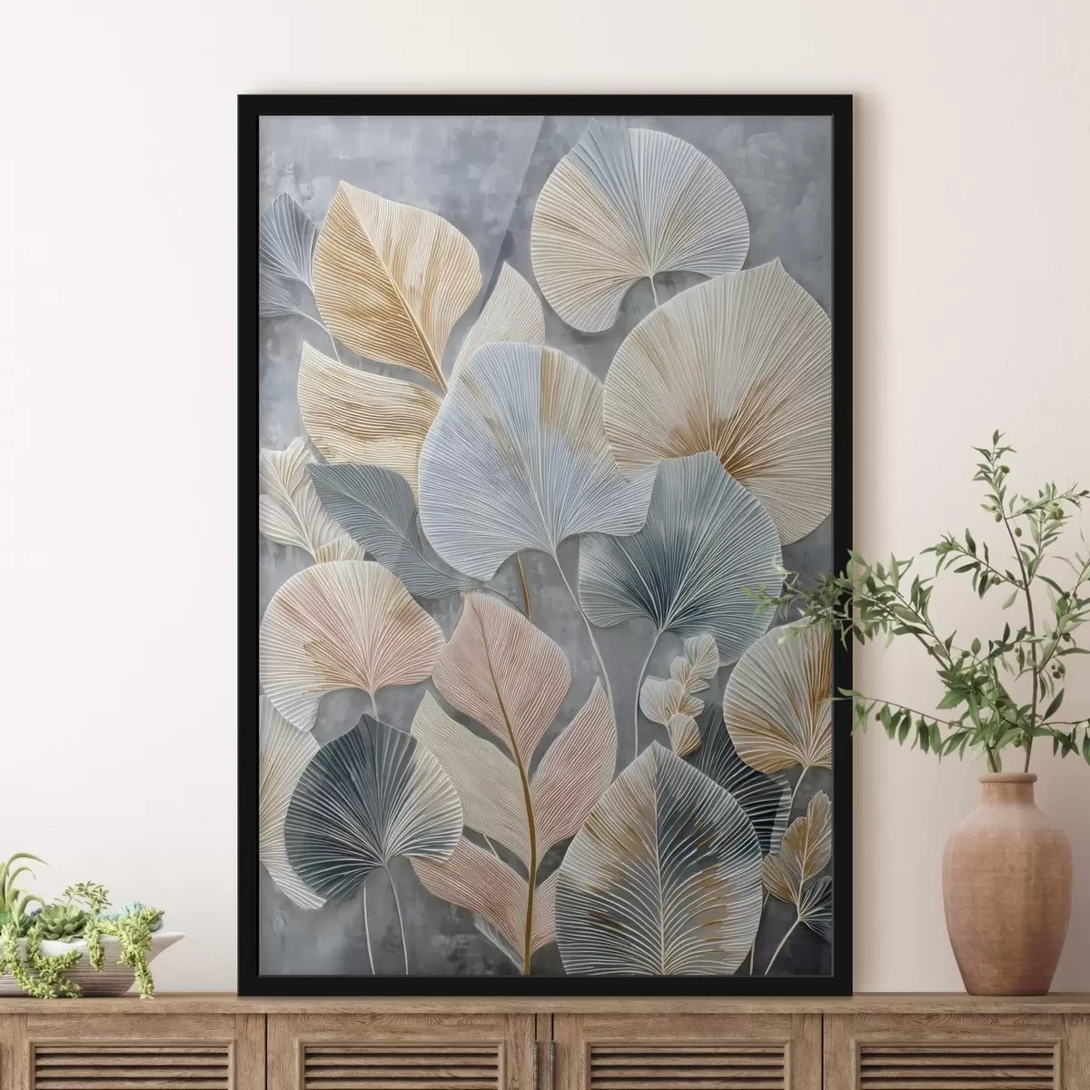 Poster Veelkleurig decoratief blad met uitgesproken textuur op een donkere achtergrond N° f47964