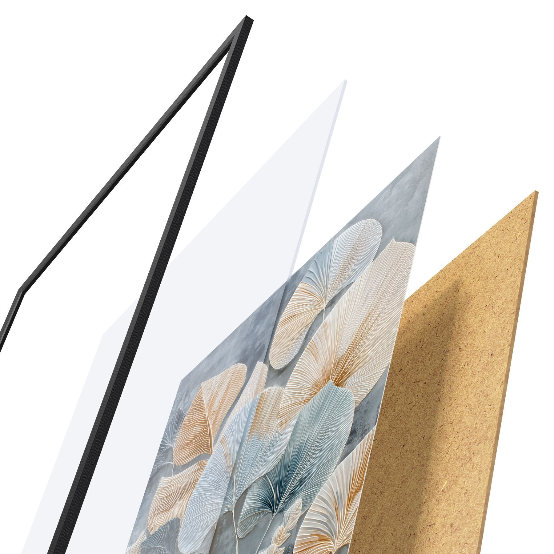 De poster bestaat uit een frame, plexiglas, geprinte afbeelding en spaanplaat achterkant. De poster kan meteen aan de muur worden gehangen dankzij de bevestigingen op de achterkant.