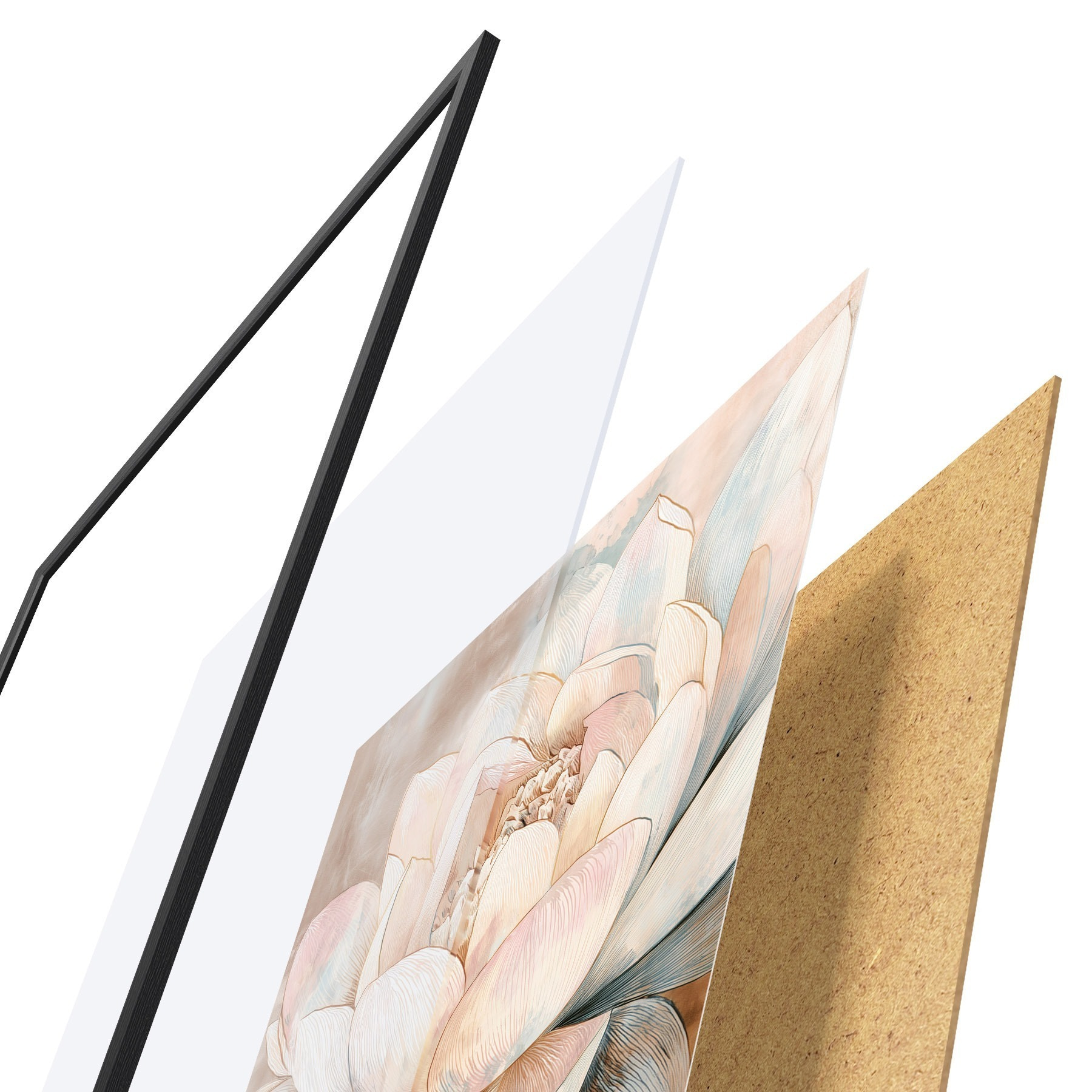 De poster bestaat uit een frame, plexiglas, geprinte afbeelding en spaanplaat achterkant. De poster kan meteen aan de muur worden gehangen dankzij de bevestigingen op de achterkant.