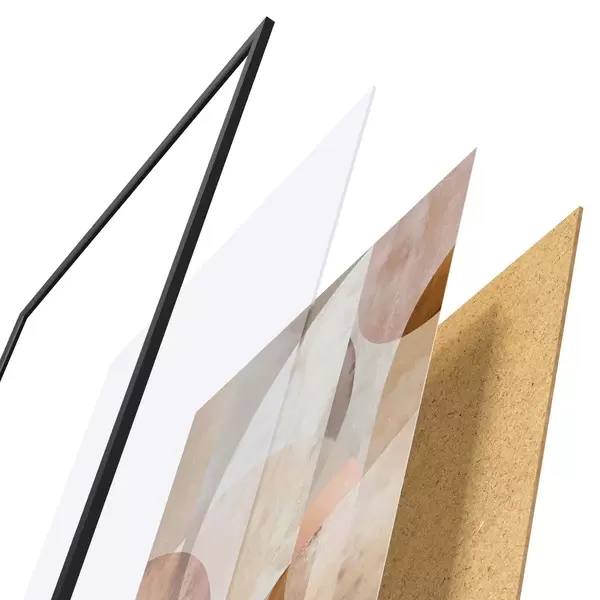 De poster bestaat uit een frame, plexiglas, geprinte afbeelding en spaanplaat achterkant. De poster kan meteen aan de muur worden gehangen dankzij de bevestigingen op de achterkant.