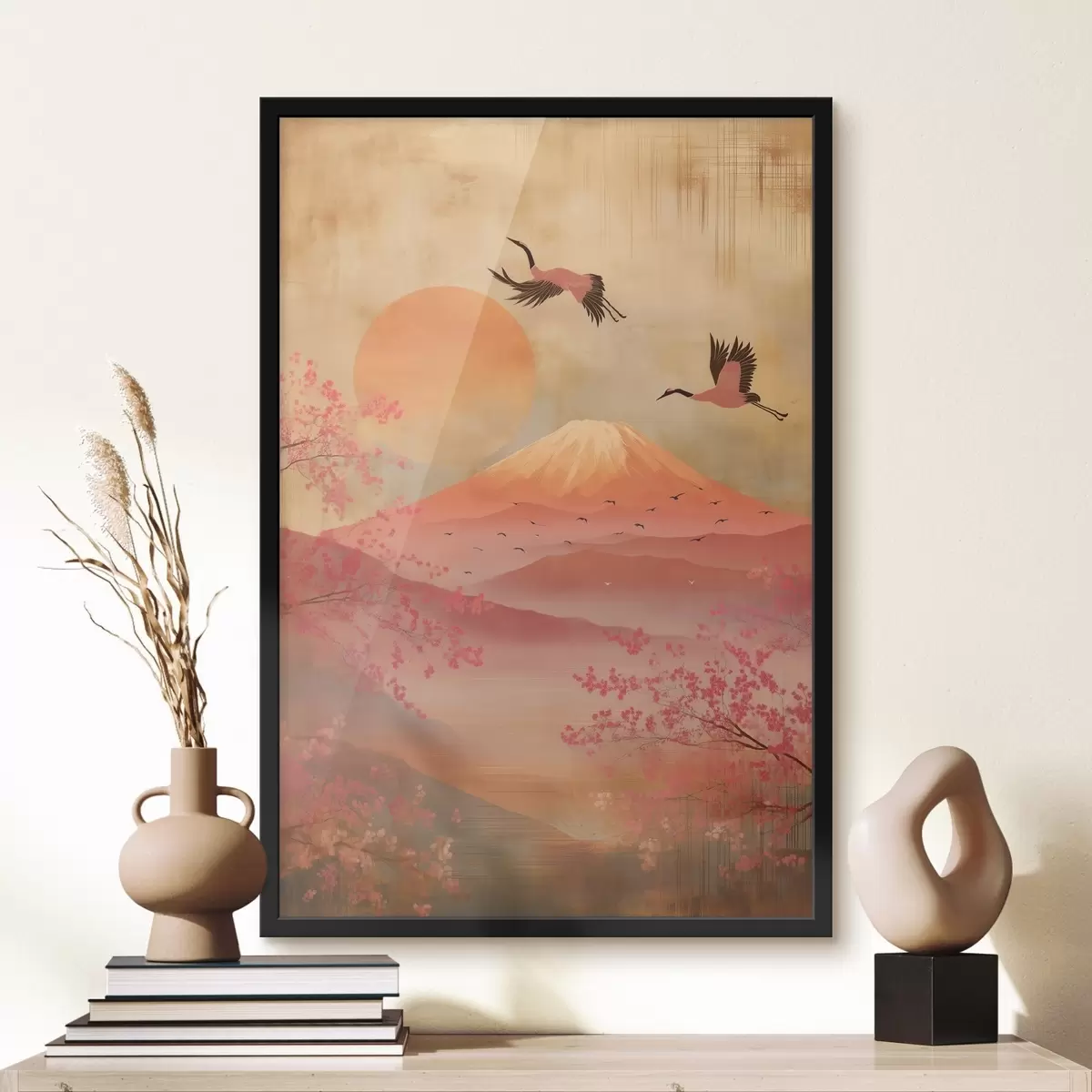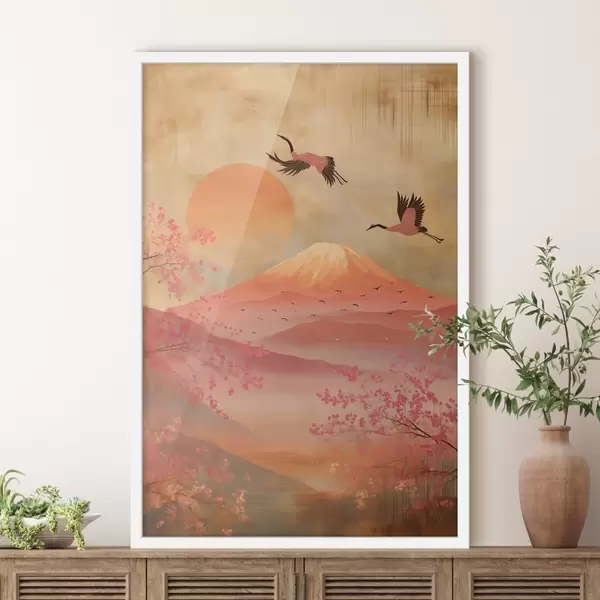 Poster Kranen tegen de zon en bergen: illustratie in digitale kunststijl N° f47992