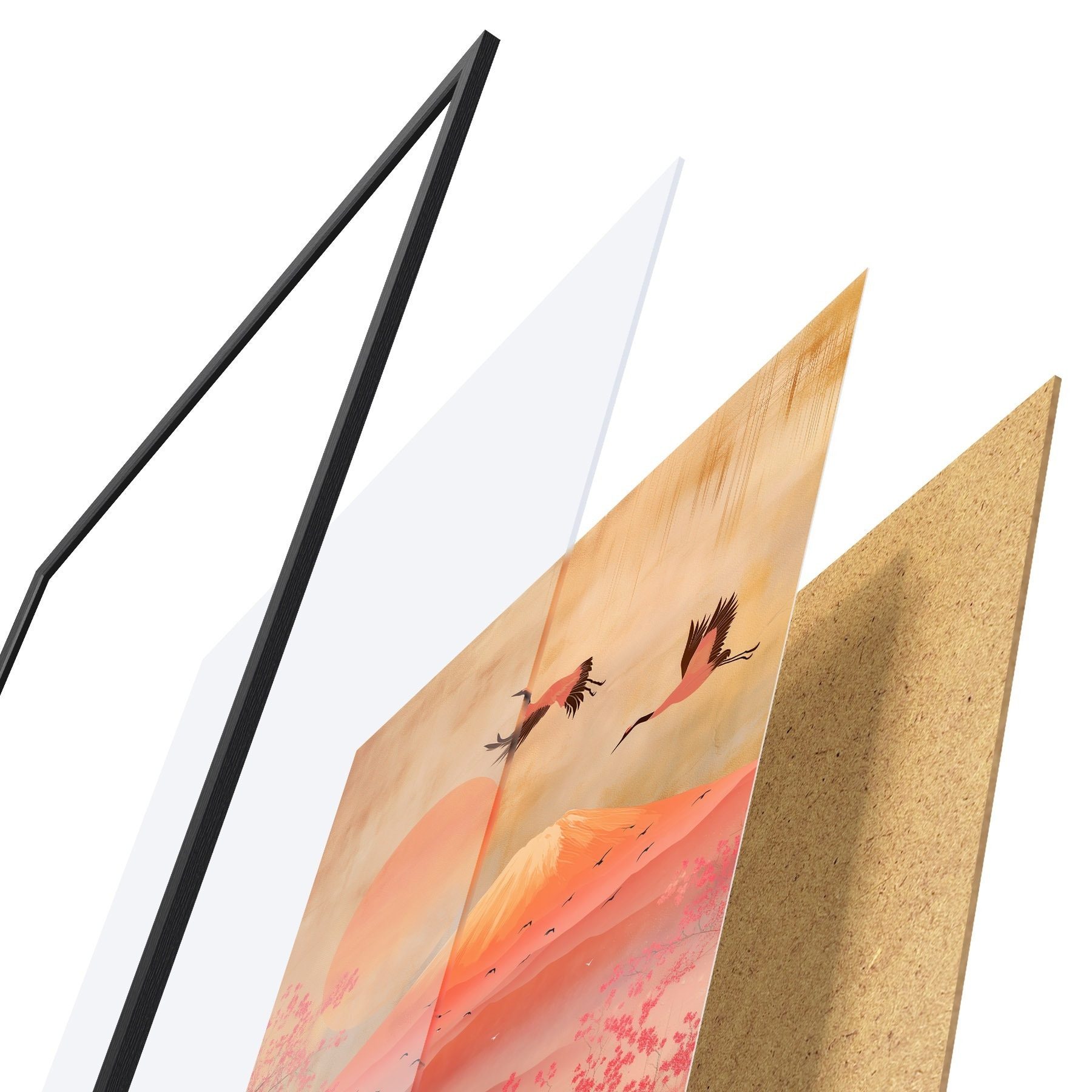 De poster bestaat uit een frame, plexiglas, geprinte afbeelding en spaanplaat achterkant. De poster kan meteen aan de muur worden gehangen dankzij de bevestigingen op de achterkant.